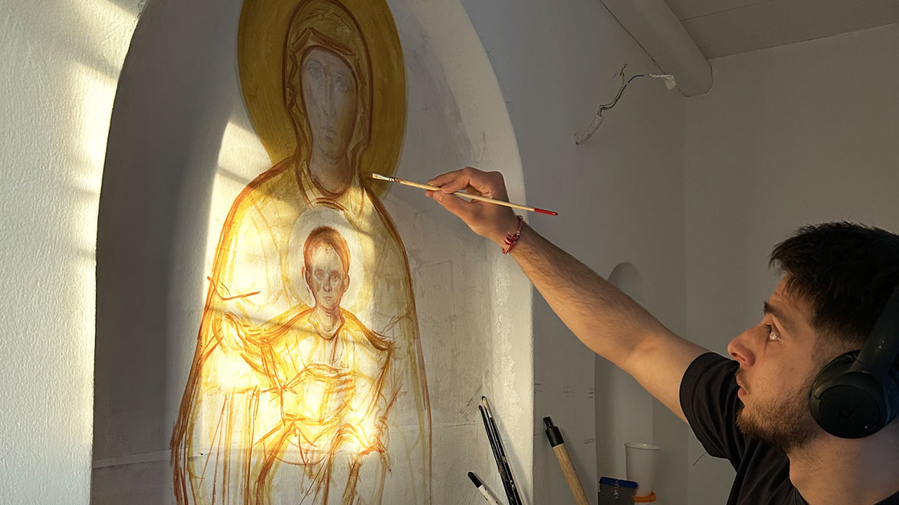 «Προσπαθώ να αντιμετωπίσω την αγιογραφία κάπως διαφορετικά και όχι περιορισμένη σε αυτό το “κλειστό” αντικείμενο, που πολλοί πιστεύουν ότι είναι. Μέσα από την καθημερινή ενασχόληση και μελέτη επιδιώκω να βρω τον δικό μου χαρακτήρα καλλιτεχνικά», λέει στην «Κ» ο 23χρονος Ιωακείμ Κουμούσης, τελειόφοιτος της ΑΣΚΤ, ο οποίος παρακολουθεί μαθήματα στο Εργαστήριο Νωπογραφίας και Τεχνικής των Φορητών Εικόνων της σχολής, με καθηγητή τον Δημοσθένη Αβραμίδη. Η αγάπη του για τη ζωγραφική άρχισε να φαίνεται ήδη από την παιδική του ηλικία, όταν εντελώς τυχαία οι γονείς του τον παρότρυναν να γραφτεί στο εργαστήριο βυζαντινής αγιογραφίας της Μητροπόλεως Πατρών. «Από τότε δεν σταμάτησα ούτε μία ημέρα να ασχολούμαι με το αντικείμενο», μας λέει την ώρα που βρίσκεται στην Τήνο, αγιογραφώντας το εκκλησάκι ενός ιδιώτη.