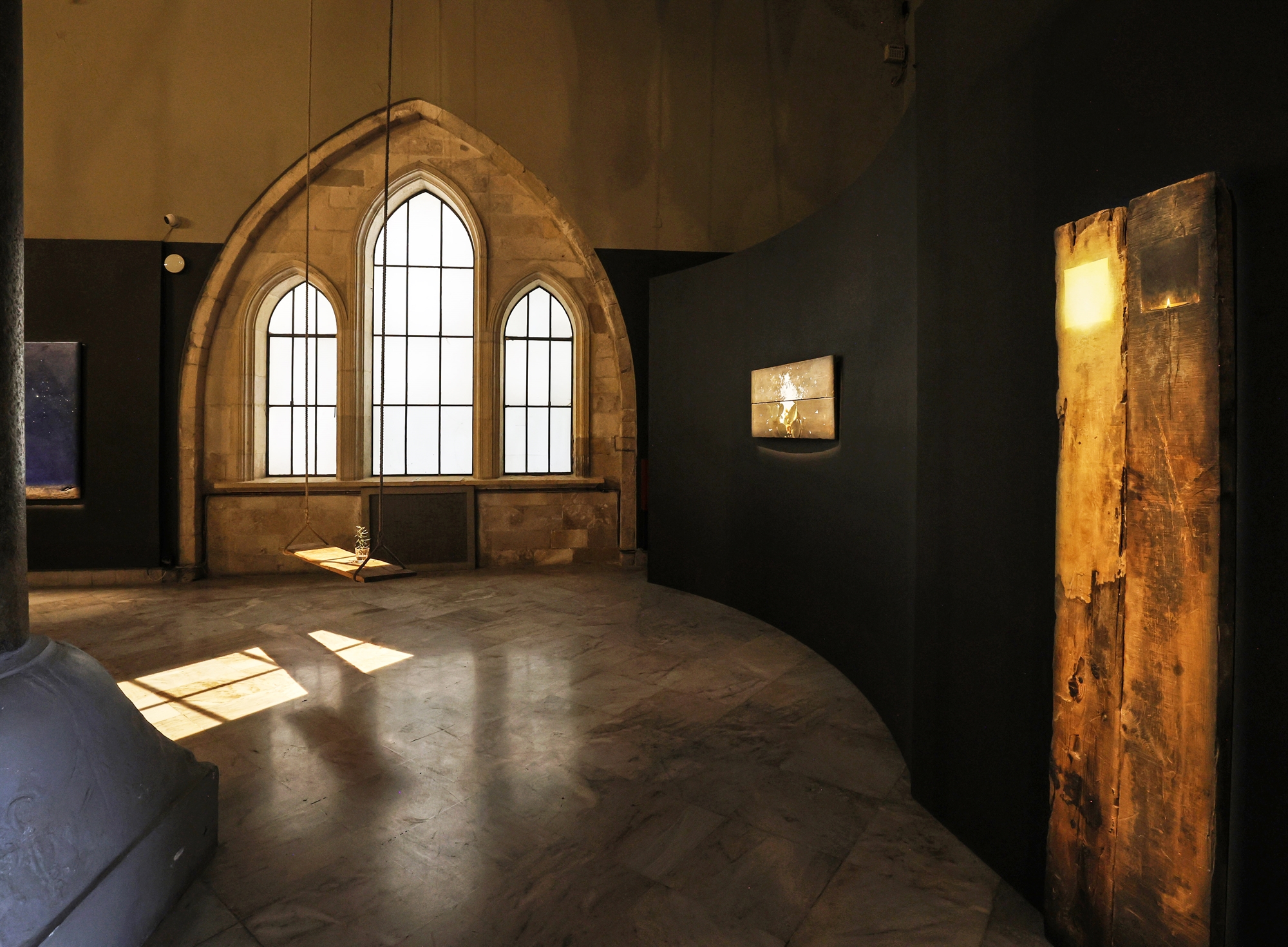 Περπατώντας μέσα στον χώρο, ο παρατηρητικός θεατής θα αναγνωρίσει χρυσές μύτες καρφιών που λάμπουν σαν αστέρια στο σκοτάδι. Θα δει επίσης συνθέσεις που εστιάζουν στα υλικά, αφαιρώντας την ίδια τη ζωγραφική από την επιφάνειά τους, έργα που συντίθενται από παλιά πανιά, παλιά ξύλα, κομμάτια από λαμαρίνα και σίδηρο. Η παραστατική ζωγραφική του Μποκόρου συναντιέται εδώ με λιτές, αφηρημένες συνθέσεις, ενώ την ίδια στιγμή το σύνολο των έργων, που καλύπτει τρεις δεκαετίες καλλιτεχνικής εργασίας, αλληλεπιδρά με τη βαρύτητα του ιστορικού μνημείου.