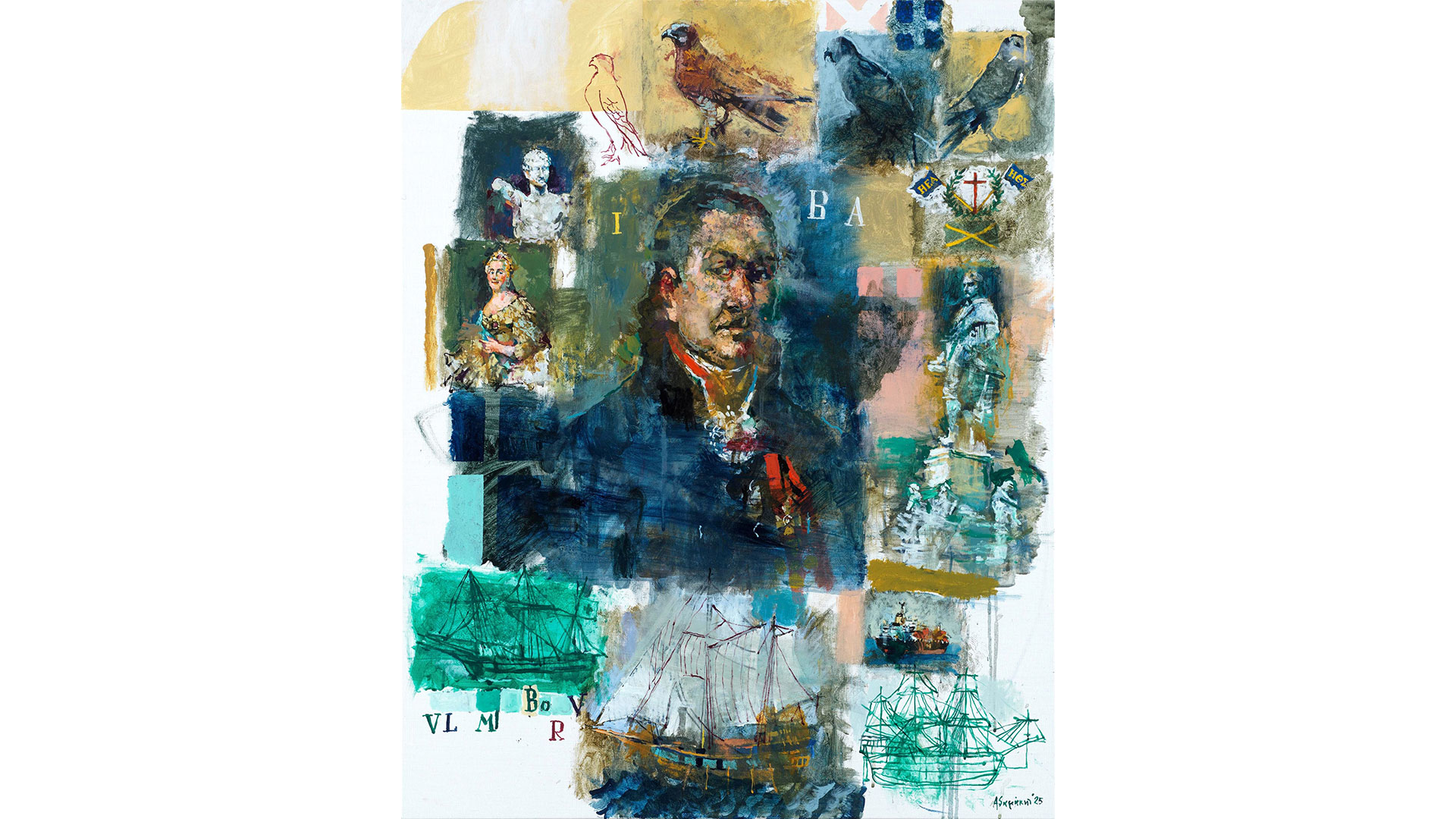 «Το πορτρέτο για ένα ζωγράφο έχει περισσότερο να κάνει με το τι εκπέμπει ο εικονιζόμενος και λιγότερο με μια περιγραφική προσέγγιση», λέει ο Γιάννης Αδαμάκης για το έργο του. «Στη συγκεκριμένη περίπτωση, ξεκινώντας από τη γνωστή προσωπογραφία, ζωγραφισμένη από τον Βλαντιμίρ Μποροβικόφσκι, προσπάθησα να την ερμηνεύσω, αφήνοντας τον εαυτό μου να εισχωρήσει στην εικόνα. Να την αποδώσω με την προσωπική μου γραφή, συμπληρώνοντάς την με διάφορα περιγραφικά στοιχεία όπως το γεράκι, τον ανδριάντα του Βαρβάκη από τον Λεωνίδα Δρόση, τον Ερμή ως τον θεό του εμπορίου, τη Μεγάλη Αικατερίνη, το σύμβολο της Φιλικής Εταιρείας και διάφορα πλοία που αναφέρονται αλλά και σηματοδοτούν τη δράση του».