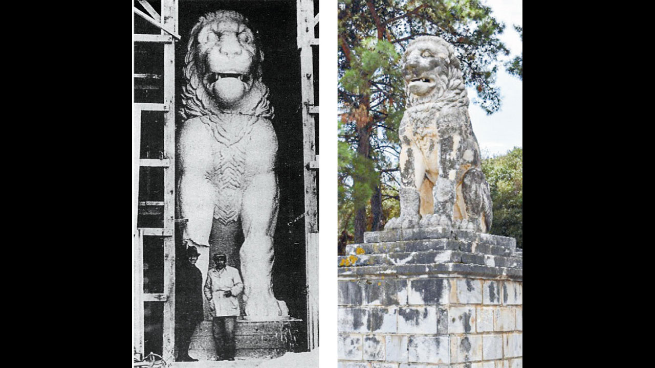 Σύγχρονες έρευνες εκτιμούν ότι στην αρχαιότητα στεκόταν ήρεμος και αγέρωχος στην κορυφή του Τύμβου Καστά. Το 1912, ωστόσο, τμήματα της βάσης του ανακαλύφθηκαν τυχαία από Ελληνες στρατιώτες των Βαλκανικών Πολέμων, ενώ το 1916 Βρετανοί αξιωματικοί του Α΄ Παγκοσμίου Πολέμου εντόπισαν στη διάρκεια κατασκευής οχυρώσεων μαρμάρινα τμήματά του. Οι τελευταίοι μάλιστα επιχείρησαν να φυγαδεύσουν τα ευρήματά τους, όμως ένας εχθρικός βομβαρδισμός ματαίωσε τα σχέδιά τους. Και όταν το 1929 η αμερικανική εταιρεία Monks-Ulen ανέλαβε την αποξήρανση της πεδιάδας των Σερρών και της Δράμας, το έργο αποδείχθηκε καθοριστικό για την ανεύρεση περαιτέρω τμημάτων του μαρμάρινου λέοντος της Αμφίπολης.