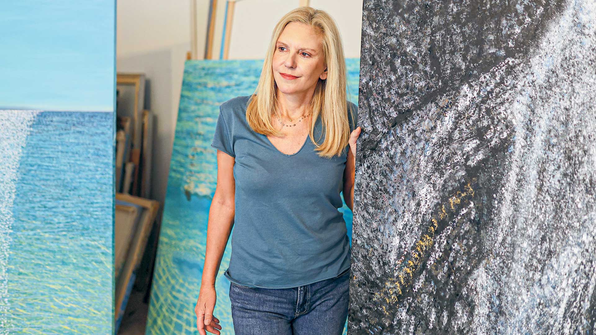 Πρωταγωνιστούν βυθός, καταρράκτες, κολυμβητές, με τους οποίους έχει βέβαια ταυτιστεί, αλλά και παλαιότερες «εμμονές» όπως είναι τα θερμοκήπια και οι εσωτερικοί χώροι. Το εντυπωσιακό σε όλα αυτά είναι ότι καταφέρνει να περιχαρακώσει χώρους αέναους όπως το πέλαγος, σε «μικρές προστατευμένες “φωλιές”» και να τιθασεύει το ατέρμονο. Η πρώτη ερώτηση ωστόσο ήταν αυτονόητη. Πώς είναι να κοιτάζει ένας ζωγράφος τον νεότερο εαυτό του με το πινέλο στο χέρι; «Είναι μια πολύ ωραία εμπειρία να βλέπεις έργα από το παρελθόν και από το παρόν κρεμασμένα το ένα πλάι στο άλλο σε ένα ωραίο μουσείο. Σαν να αντικρίζει κανείς την ενηλικίωσή του. Και με χαροποιεί που δεν είμαι αυστηρή, αλλά τρυφερή με τη νεανική μου ηλικία. Ζωγραφίζει κάποιος αυτό που είναι και έχει ενδιαφέρον σήμερα να μπορώ να δω με ακρίβεια πώς ένιωθα τότε, τι έβλεπα γύρω μου, τι είχε σημασία για εμένα», υπογραμμίζει για αυτήν την αναδρομική παρουσίαση, που μοιάζει σαν να ξεφυλλίζει ένα οπτικό ημερολόγιο. Το παλιότερο έργο της έκθεσης είναι του 1995. Αναρωτήθηκα τι έχει κερδίσει μέσα από τη διαδρομή της στον χρόνο; «Την περιπέτεια της ίδιας της ζωγραφικής, τι άλλο; Κάθε ζωγράφος κατακτά την αυτογνωσία του στον καμβά, δίνει μάχες με τον ίδιο του τον εαυτό, μαθαίνει και από αυτά που καταστρέφει, όχι μόνον από αυτά που κρατάει. Το θετικό είναι πως πρόκειται για έναν αγώνα που δεν σταματά ποτέ, ούτε φτάνει σε έναν κορεσμό από την εμπειρία. Το ζητούμενο είναι να βελτιώνεσαι συνέχεια, να γίνεσαι καλύτερος. Είναι μια συνεχής πάλη πολύ μοναχική μιας και εγώ δεν εργάζομαι καν με μοντέλο στο εργαστήριό μου. Ετσι, λοιπόν, μια έκθεση μου δίνει την ευκαιρία να επικοινωνήσω ό,τι κάνω, αλλά να δω από κοντά και την ανταπόκριση των θεατών. Είναι ένας πολύ γόνιμος διάλογος, διότι εκεί καταλαβαίνεις και κάτι ακόμη: αν βαστάνε τα παλιότερα έργα μέσα στον χρόνο. Μου δίνει πολύ κουράγιο να αρέσουν, λ.χ., στα νέα παιδιά, διότι έτσι θεμελιώνεται και η σχέση που έχω ως καλλιτέχνις με την ίδια την εποχή μου».