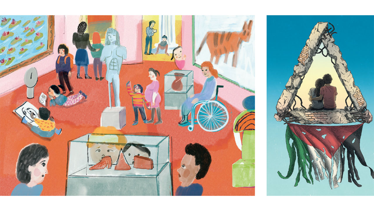 Από την άλλη πλευρά η εικαστικός Αγγελική Μπόζου αποφάσισε να εικονογραφήσει ένα όχι και τόσο «δημοφιλές» δικαίωμα: «θέλησα να αποτυπώσω με κάποιον τρόπο το δικαίωμα στην τέχνη, το οποίο προϋποθέτει, άλλωστε, όλα τα υπόλοιπα», μας λέει η ίδια για το έργο της, το οποίο απεικονίζει μία αίθουσα μουσείου μέσα στην οποία τα παιδιά αλληλεπιδρούν με τα εκθέματα.