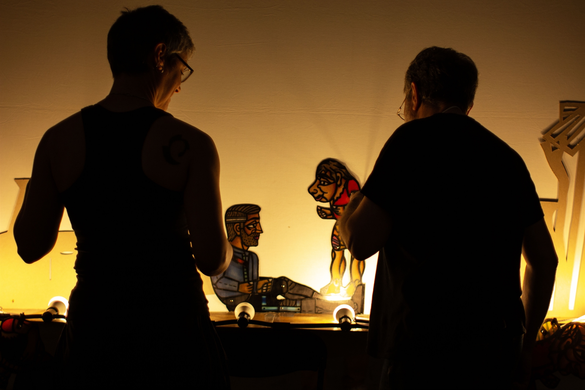 Τους χαρακτήρες θα ζωντανέψει ο διάσημος σκιοπαίκτης Αθως Δανέλλης, μαζί με την Αγγελίνα Λυκογιάννη, ο οποίος όπως μας τονίζει ο κ. Αγγελόπουλος, αποτελεί την καρδιά του έργου. «Λέμε καμιά φορά στις πρόβες ότι αν άλλαζαν εμένα ή κάποιον από τους υπόλοιπους συντελεστές η παράσταση πάνω-κάτω θα μπορούσε να παραμείνει ίδια. Αν άλλαζαν όμως τον Αθω, θα μιλούσαμε για άλλη παράσταση».
