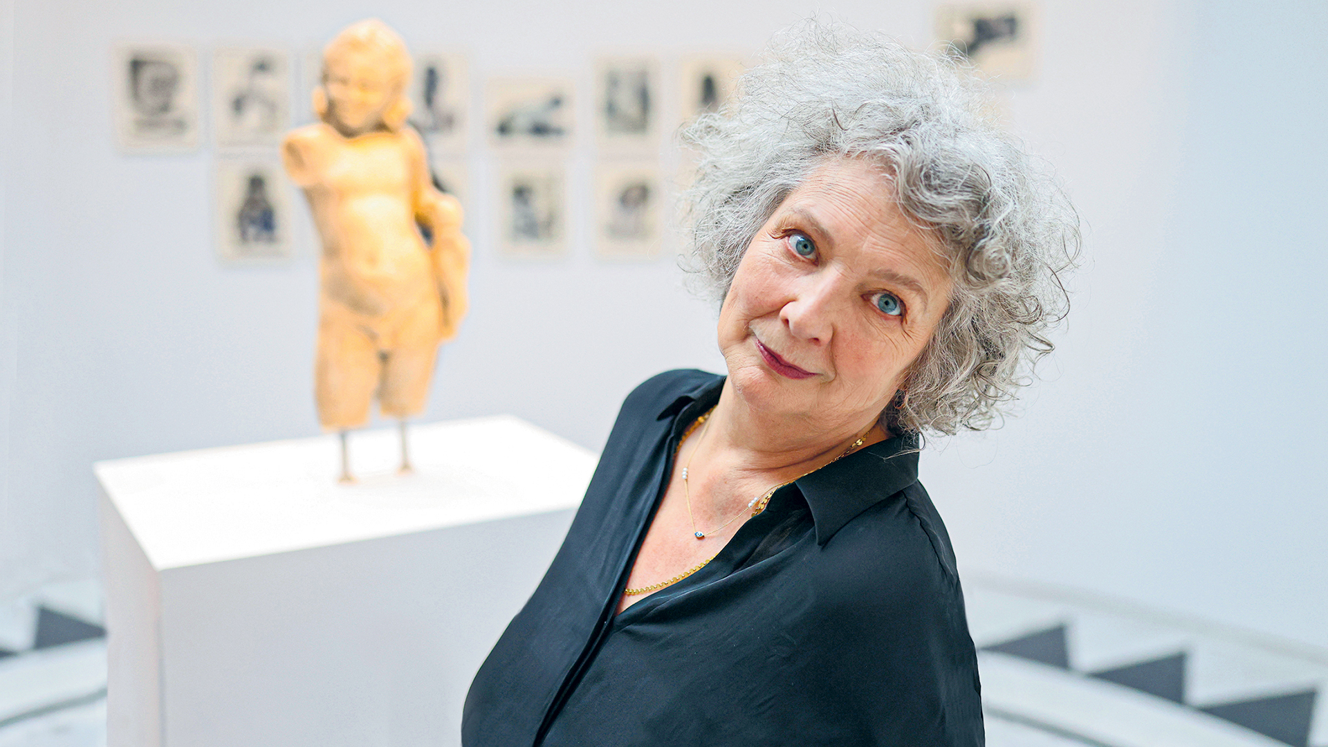 Η Μαρλέν Ντουμά αφήνει το ποτήρι της στο παρκέ δίπλα στα πόδια της κι αρχίζουμε να μιλάμε. Πίσω της, στο βάθος της αίθουσας σαν φόντο έχει τον πίνακα «Old», πίσω μου εκείνη βλέπει το «Phantom Age». Και τα δύο είναι ώριμα έργα που δημιούργησε φέτος για την αναδρομική έκθεση με τίτλο «Marlene Dumas: Cycladic Blues», που φιλοξενείται στο Μουσείο Κυκλαδικής Τέχνης. Πηγή έμπνευσης των δύο έργων είναι η εικόνα ενός ρωμαϊκού αντιγράφου ελληνιστικού γλυπτού του 2ου αιώνα π.Χ. που ονομάζεται «Η ηλικιωμένη γυναίκα της αγοράς». «Μια αρχαία κυρία», λέει η Ντουμά, «που δεν ήταν απλώς μια αξιοσέβαστη ηλικιωμένη, αλλά μια μεγάλη σε ηλικία εταίρα καθ’ οδόν προς τη γιορτή του Διονύσου. Μπορεί να γίνει και διασκεδαστικό το να είσαι 70 ετών», προσθέτει με θάρρος, όχι με αφέλεια.