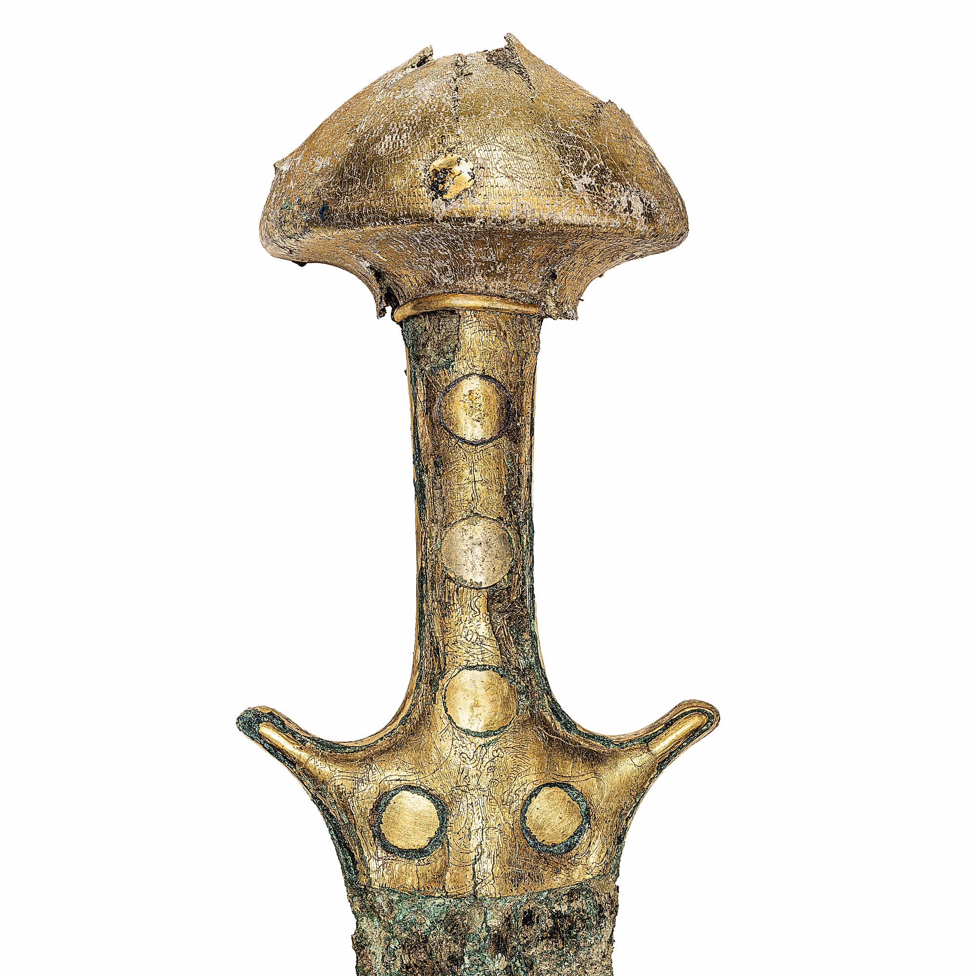 Ιδιαίτερο ενδιαφέρον παρουσιάζει το ξίφος του πολεμιστή, του οποίου η λαβή είχε επιχρυσωθεί με μια απαιτητική και σπάνια τεχνική, παρόμοια με κέντημα. «Είναι μοναδικό, γιατί ο χρυσός φέρει κομψά χαραγμένη εικονογραφία, που δείχνει λιοντάρια να κατασπαράσσουν κρητικά αγρίμια. Το συμφραζόμενο της ανακάλυψης του ξίφους επιτρέπει τη χρονολόγησή του στη νεοανακτορική περίοδο (περ. 1700-1450 π. Χ.), αλλά υποδηλώνει ότι το ίδιο και παρόμοια έργα κατασκευάζονταν και εκτός Κρήτης. Η εικονογραφία συνδέεται με την έννοια της δύναμης και μας έκανε να αναρωτηθούμε αν ο Γρύπας Πολεμιστής ήταν ο πρώτος ή ένας από τους πρώτους που διεκδίκησαν τον τίτλο του Μυκηναίου άνακτα», υπογραμμίζουν οι Ντέιβις και Στόκερ.