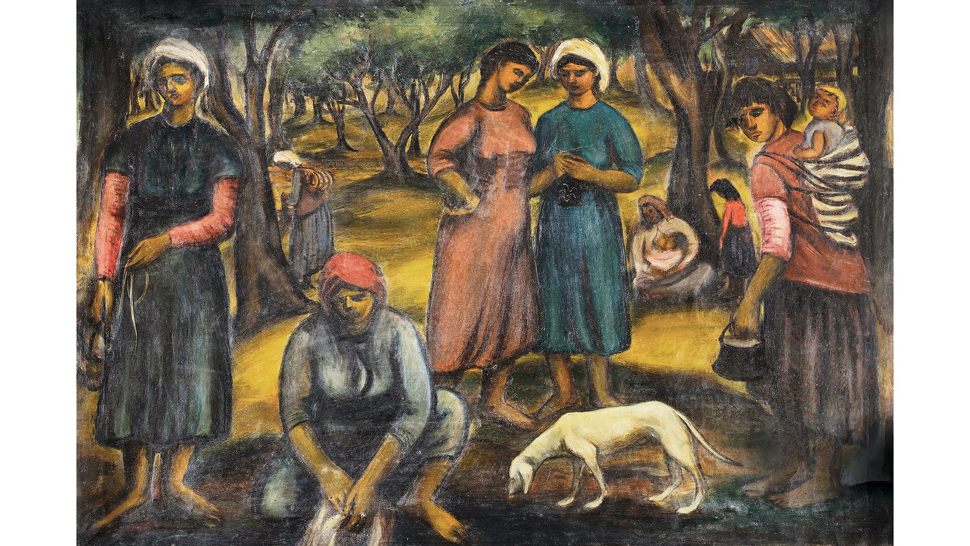 Δεν είναι τυχαίο, λοιπόν, πως ανάμεσα στα έργα που παρουσιάζονται για πρώτη φορά στο κοινό βρίσκεται η ελαιογραφία «Γυναίκες στον ελαιώνα» (περ. 1941-42). Εικονίζονται μερικές χωρικές να εκτελούν καθημερινές εργασίες: το πλύσιμο των ρούχων, το γνέσιμο του μαλλιού, το άρμεγμα των ζώων. Ολες μαζί εικονογραφούν την καθημερινότητα του φύλου τους στην ελληνική αγροτοποιμενική κοινωνία. Εδώ εντοπίζεται ήδη ένα εμβληματικό μοτίβο της μετέπειτα χαρακτικής της: η μάνα που βιώνει τη φτώχεια και τις κακουχίες παλεύοντας να μεγαλώσει το σπλάχνο της.