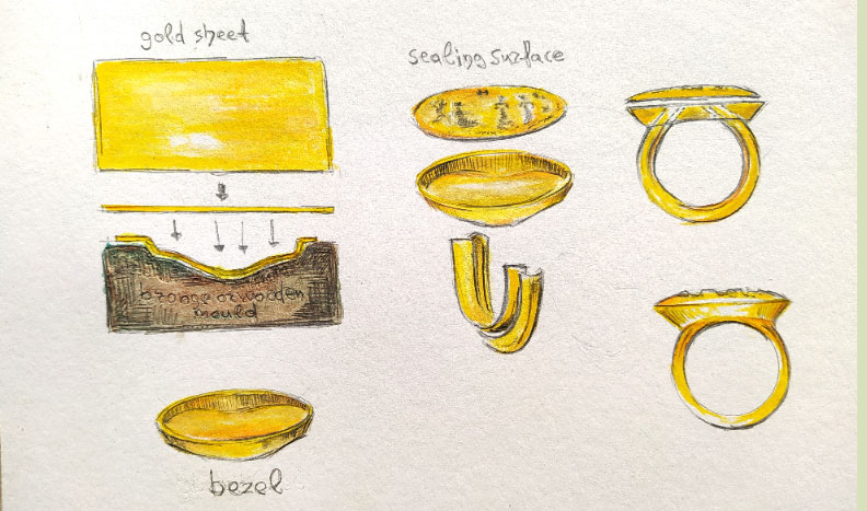 Ειδικότερα, με τη βοήθεια πειραματικής κατασκευής δαχτυλιδιού με μήτρα από ειδικό πέτρωμα (στεατίτης), ώστε να εξεταστεί πόσο ανθεκτική ήταν η τελευταία σε θερμοκρασίες χύτευσης, διαπιστώθηκε ότι η μήτρα έσπασε, δημιουργώντας ανωμαλίες στο αντικείμενο. «Δεν υπήρχε περίπτωση να ασχοληθεί κάποιος με μια μήτρα –που ήθελε και πολλές ώρες σκαλίσματος– και αυτή να σπάσει με την πρώτη χρήση, επομένως είναι πιθανό οι μήτρες να χρησιμοποιήθηκαν για ένα καλούπι και στη συνέχεια το δαχτυλίδι να κατασκευάστηκε με την “τεχνική του χαμένου κεριού”», λέει η κ. Κωνσταντινίδη-Συβρίδη και εξηγεί ότι το ενδεχόμενο έχει ακουστεί και παλιότερα, αλλά πλέον επιβεβαιώνεται.