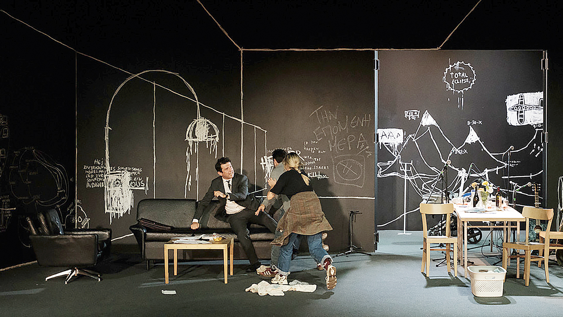 Η δράση τοποθετείται στο σκηνικό του Γιαν Πάπελμπαουμ, στο μίνιμαλ αστικό σαλόνι όπου δεσπόζει ένας τεράστιος μαυροπίνακας ζωγραφισμένος με λευκή κιμωλία από την Καταρίνα Ζίμκε. Εκεί αποτυπώνονται σκίτσα τεραστίων διαστάσεων, στενά συνυφασμένα με τις πολιτικές εντάσεις και τις ενδοοικογενειακές διενέξεις. Ο σχεδιασμός του ήχου από τους Μαλτέ Μπέκενμπαχ και Ντάνιελ Φράιταγκ δημιουργεί μια ροκ ατμόσφαιρα, με ωραίο ρυθμό και παύσεις, στον χώρο όπου ο γιατρός Στόκμαν κάνει πρόβες με τη ροκ μπάντα που έχει δημιουργήσει με τους φίλους του δημοσιογράφους και τη σύζυγό του την Καταρίνα.