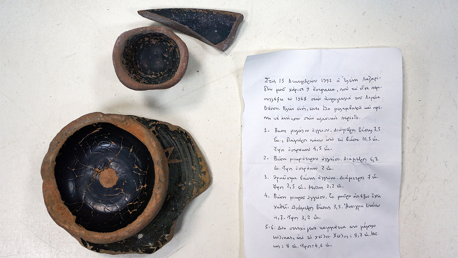 Ενα χερούλι αγγείου ρωμαϊκών χρόνων «το βρήκα στο τείχος κοντά στο τρίτο γυμνάσιο Αρρένων στις 2 Σεπτεμβρίου του 2006» ή «δώδεκα ευτελή όστρακα μου έδωσε ο…», σημειώνει μεταξύ άλλων για τα δικά του ευρήματα ή για όσα του χάρισαν, αναφέροντας δρόμους, περιοχές, ημερομηνίες και ονόματα δωρητών: οδός Λαγκαδά, οδός Ολυμπιάδος, Επταπύργιο, Ιερισσός, Γερακινή, χαρίσματα της Σούλας Πιτέρη, της Ελένης Λαζαρίδου κ.ά.