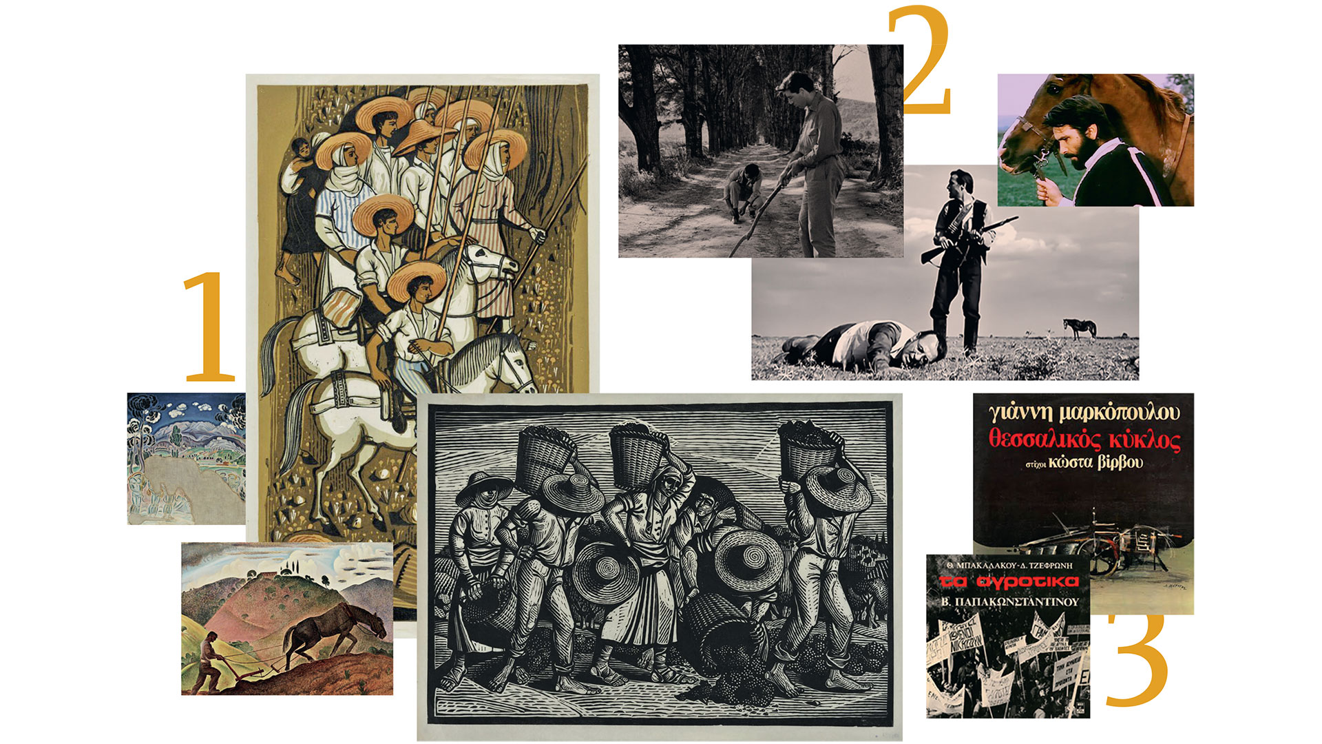 Ας ξεκινήσουμε τη σταχυολόγησή μας από πιο πρόσφατα. Από τη Σχολή του Μονάχου για παράδειγμα, της οποίας οι εκπρόσωποι (Γύζης, Λύτρας κ.ά.) ενδιαφέρονται μεταξύ άλλων και για μια ηθογραφία της υπαίθρου, βλέποντάς την ως σύμβολο της παράδοσης και των αξιών του νεαρού ελληνικού κράτους, αλλά και ως πηγή ποικίλων χρωμάτων και φωτισμών. Αφήνοντας κατά μέρος την ξεχωριστή περίπτωση του Θεόφιλου με τα διάφορα αγροτικά θέματα, στις επόμενες δεκαετίες, οι τάσεις αστυφιλίας είχαν ως αποτέλεσμα και μια σύνδεση των αγροτικών εργασιών με την απλότητα, τη σκληρή και έντιμη δουλειά, τις κοινωνικές διεκδικήσεις. Ενδεικτικά παραδείγματα είναι ο εξπρεσιονιστικός σοσιαλιστικός ρεαλισμός του Βάλια Σεμερτζίδη (1911-1983), σε έργα όπως το «Οργωμα» και το «Ράβδισμα της ελιάς», καθώς και τα χαρακτικά του Τάσσου (1914-1985) με τίτλους όπως «Τρύγος», «Αγρότες της Μεσσηνίας», «Θερισμός».