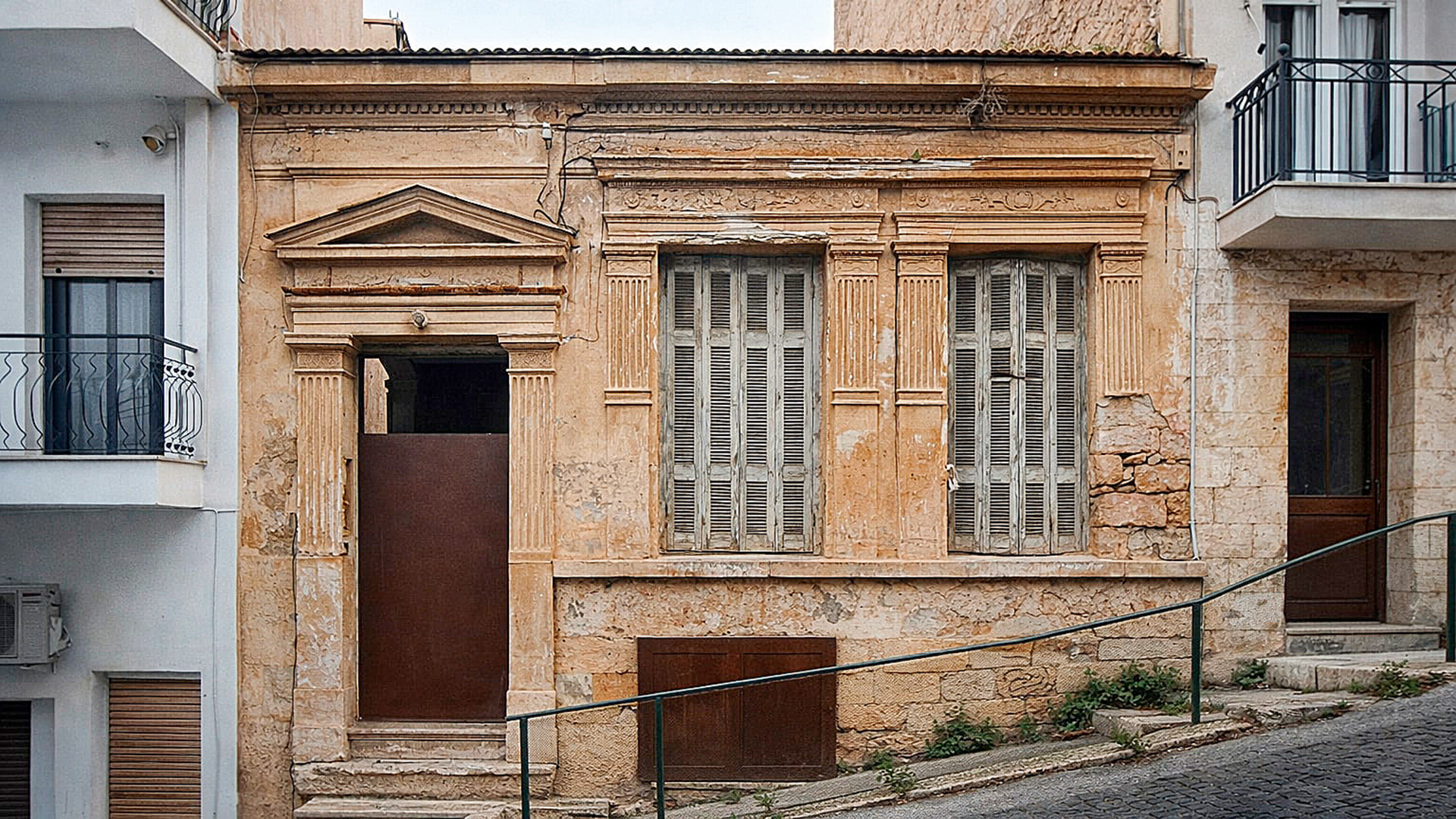 Το αέτωμα πάνω από την πόρτα έχει βαθύ τύμπανο, είναι στέρεο και ξεκουράζεται πάνω σε διακεκομμένο θριγκό, που του δίνει βάρος και υπόσταση. Τα δύο παράθυρα με τα γαλλικά παραθυρόφυλλα (βαμμένα σε γαλακτερό υπογάλαζο γκρί χρώμα, όπως ήταν το σύνηθες) στέκουν σφιχτά σε παράταξη με τις όμορφα σμιλεμένες παραστάδες τους, με μια αίσθηση δωρικής χάρης να ξετυλίγεται…