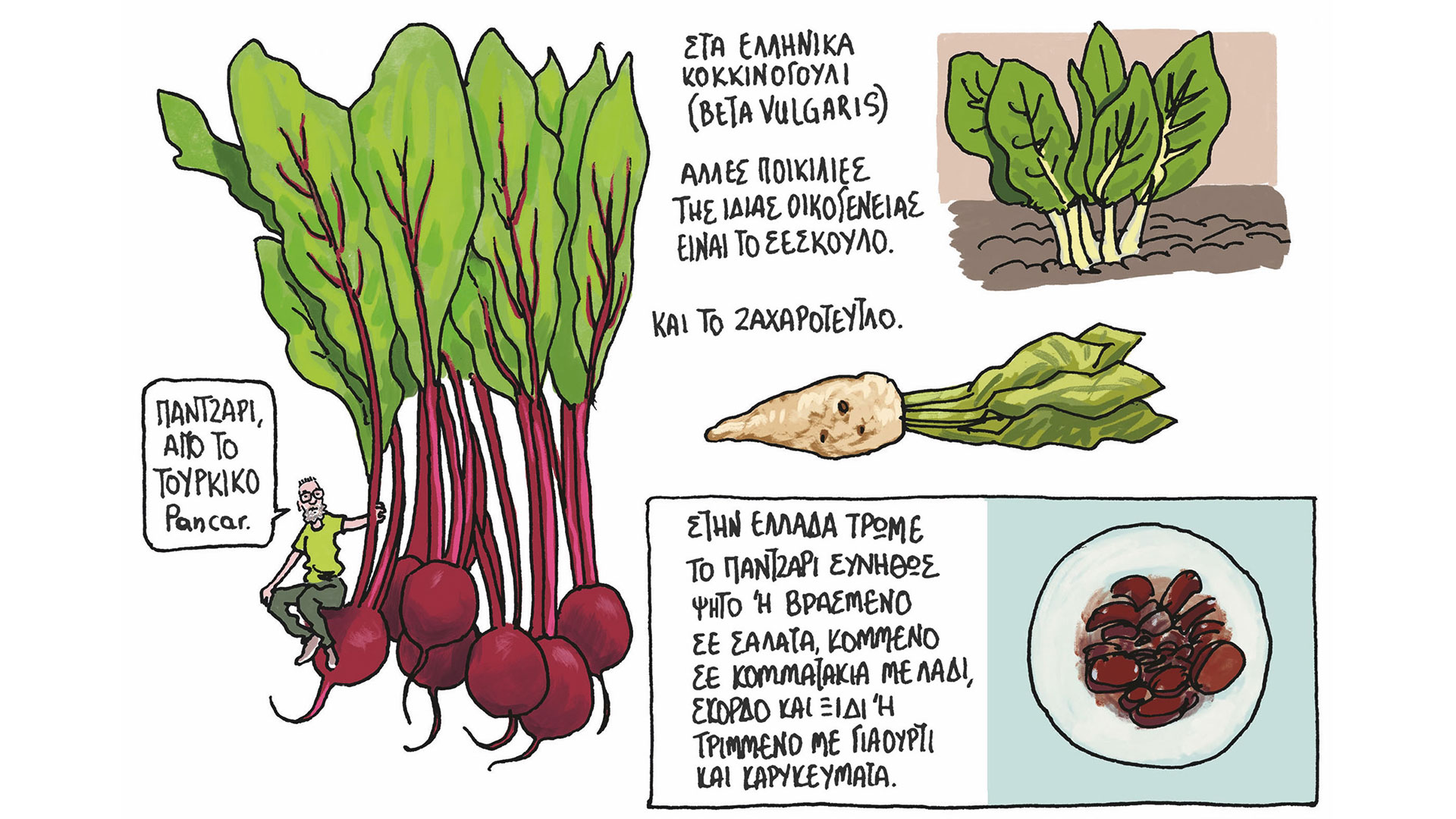 Από τις δικές του αγαπημένες ιστορίες είναι εκείνη του αλατιού, την οποία μας αφηγείται στις πρώτες σελίδες του κόμικ, στο κεφάλαιο με τα «Βασικά υλικά» μιας διατροφής. «Το αρχαίο ελληνικό “αλς”, γνωστό σήμερα ως “αλάτι”, έγινε “sal” στα λατινικά. Το “salarium” δήλωνε τα χρήματα που έπαιρναν οι λεγεωνάριοι για να αγοράσουν αλάτι. Από εκεί προέρχεται το αγγλικό “salary” και το γαλλικό “salaire”, που σημαίνουν τον “μισθό” με τον οποίο αμείβεται κάποιος», μας λέει.
