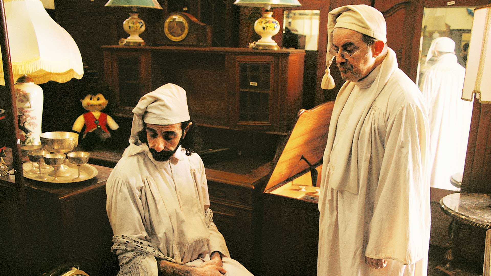 Μάλλον, καθοδηγούνται προς αυτήν την εικασία. Ενδυματολογικά, ας πούμε, φορούν και οι δύο νυχτικό, μακρύ έως τον αστράγαλο και σκουφί νυκτός, όπως γνωρίζουμε το εν λόγω συνολάκι από την εποχή του βωβού κινηματογράφου. Μετά είναι και οι προβολείς σκηνής πορτοκαλόχρυσου χρώματος, που παράγουν γλυκιά και θερμή αμυδρότητα του φωτισμού. Εν κατακλείδι, είναι σίγουρα ονειρώδες το περιβάλλον. Και κατά συνέπεια η αίσθηση του εξωπραγματικού –του πέραν των φυσικών νόμων και λογικών κανόνων– αφήνει περιθώρια για φαντάσματα. Κι έτσι, συμβιβάζεται ο θεατής με την ιδέα ότι όσα συμβαίνουν μπροστά του πιθανώς να είναι αποκύημα είτε φαντασίας είτε ονείρου ή να είναι μια κάπως τραβηγμένη χαριτωμένη παραδοξότητα της πραγματικότητας.