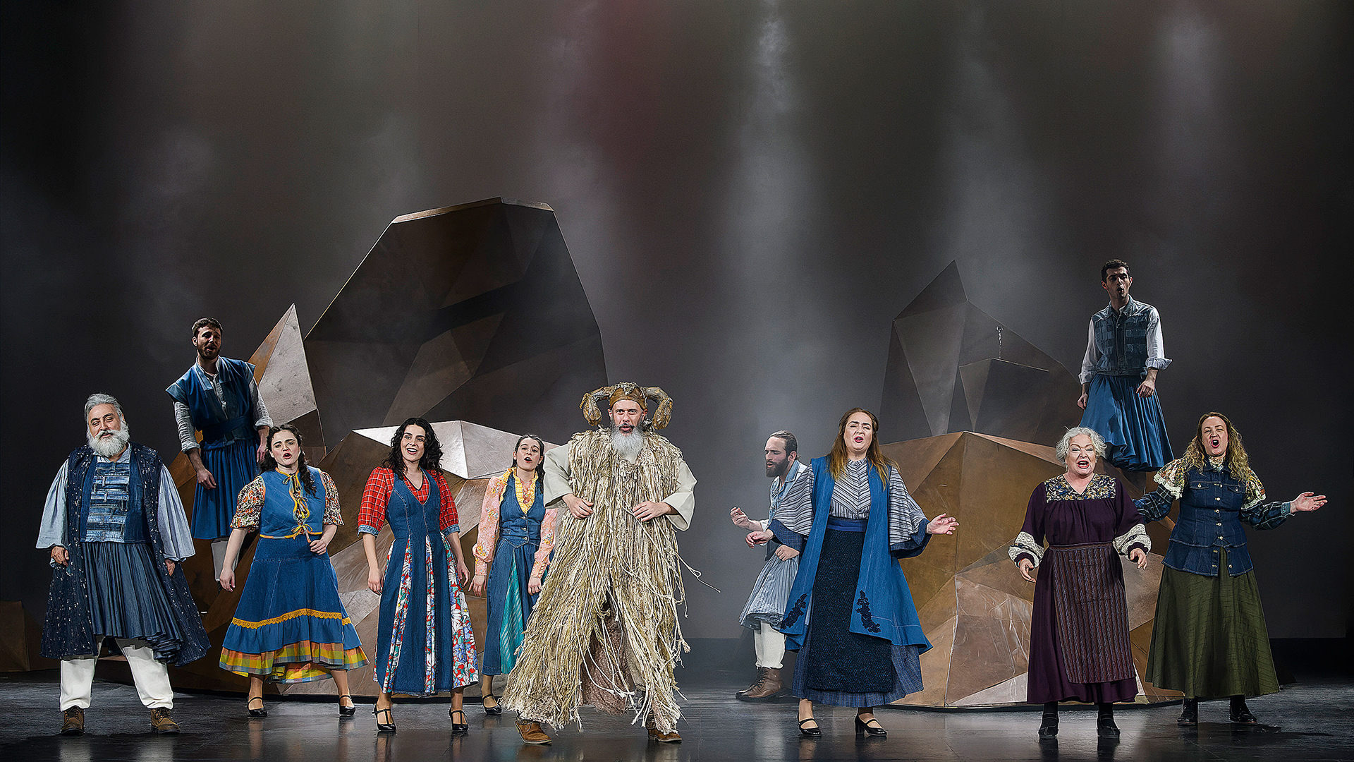 Η Εύα Μανιδάκη έστησε ένα εντυπωσιακό σκηνικό δύο ορεινών όγκων, εξαιρετικά συμβολικών, ενώ οι στυλάτες τζιν φουστανέλες της Βάνας Γιαννούλα εκπλήσσουν με τους χρωματικούς συνδυασμούς τους, συνθέτοντας ένα εικαστικό υπερθέαμα απολύτως εναρμονισμένο με την αισθητική του σύγχρονου θεάματος.