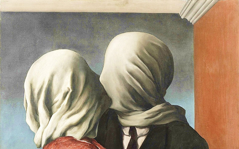 Το έργο του Βέλγου σουρεαλιστή Ρενέ Μαγκρίτ «Οι εραστές» είναι το πρώτο από μια σειρά τεσσάρων έργων με το ίδιο θέμα. Απεικονίζει ένα ζευγάρι, έναν άνδρα και μια γυναίκα, που ανταλλάσσουν ένα φιλί. Τα κεφάλια τους καλύπτονται εντελώς από ένα λευκό ύφασμα, τα πρόσωπά τους κρύβονται κάτω από αυτό το ύφασμα, πέπλο, κουκούλα, μάσκα. Δεν μπορούν να δουν ο ένας τον άλλον, δεν μπορούν να αγγίξουν ο ένας τον άλλον, παρά μόνο μετ’ εμποδίων. Το φιλί τους διακόπτεται από τη μάσκα που τους καλύπτει, το δέρμα μονώνεται, ο χαρακτήρας και η αίσθηση της ερωτικής επικοινωνίας μεταλλάσσονται. Αν και ορισμένοι απέδωσαν το μοτίβο του καλυμμένου προσώπου, που εμφανίζεται ξανά στο έργο του Μαγκρίτ, στην τραυματική εμπειρία της αυτοκτονίας της μητέρας του, της οποίας το πτώμα ανασύρθηκε από το νερό με το υγρό νυχτικό της τυλιγμένο γύρω από το πρόσωπό της, o ίδιος αρνήθηκε τέτοιους συσχετισμούς. Υποστήριζε ότι η ζωγραφική του ήταν ορατές εικόνες που δεν έκρυβαν κάτι και ότι «αποπνέουν μυστήριο και πράγματι κανείς αναρωτιέται τι σημαίνουν. Δεν σημαίνουν κάτι, γιατί το μυστήριο δεν σημαίνει τίποτα επίσης, δεν είναι δυνατό να γνωσθεί».