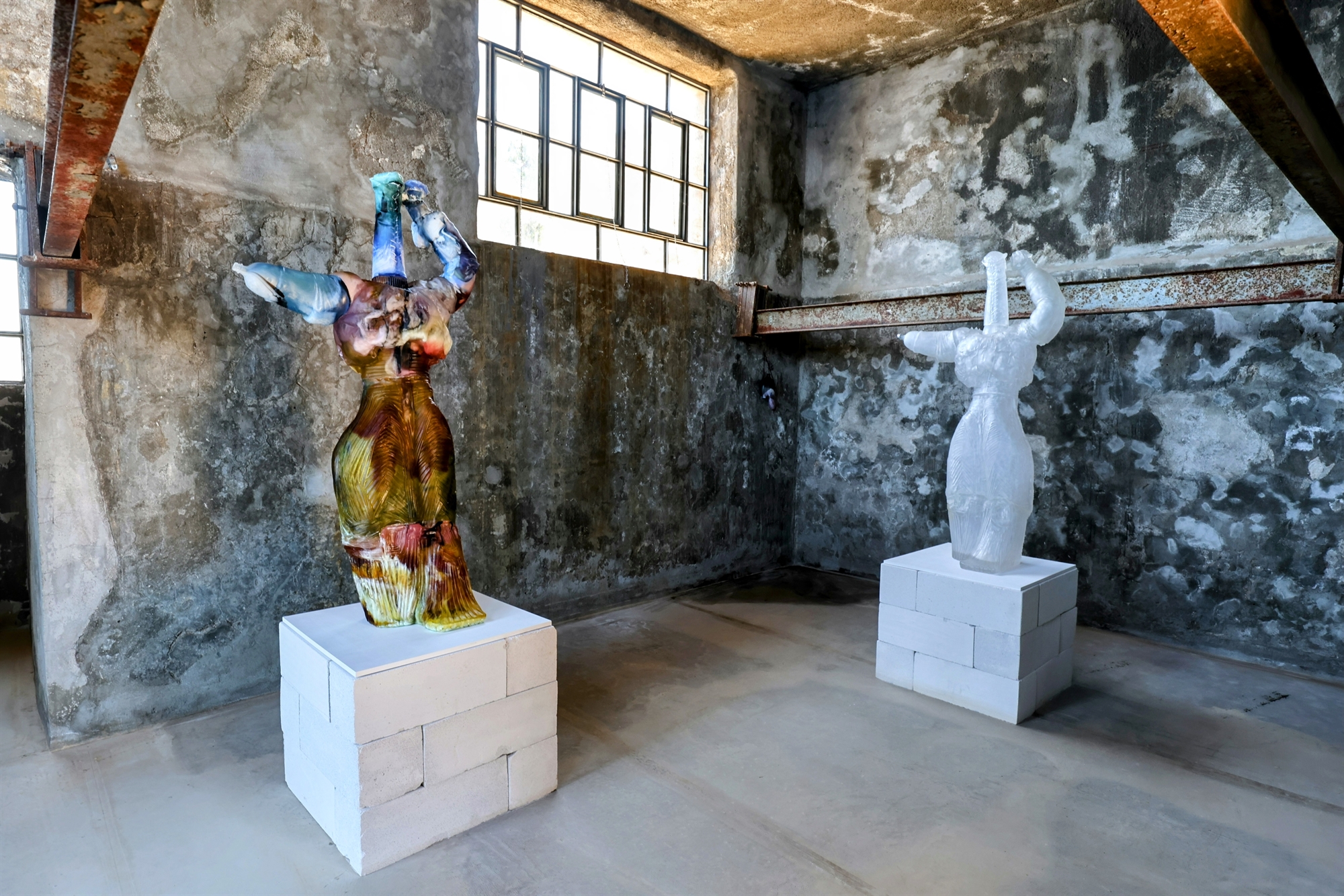 Πραγματικά, παρατηρώντας τη χυτευμένη σε μπρούντζο καρέκλα που μας «κοιτάζει» μέσα από το «κελί» της, αναρωτιόμαστε εάν είναι χρηστικό αντικείμενο ή ο σκελετός ενός εξωγήινου πλάσματος. Ο τρόπος που παρουσιάζονται αυτά τα θραύσματα σωμάτων, μυθολογικών τεράτων ή allien που αποτελούν τη νέα ενότητα «Desolation Ware» είναι εμπνευσμένος από το πώς φυλάσσονται στις αποθήκες των μουσείων τα αρχαιολογικά θραύσματα που δεν είναι αρκετά σημαντικά για να εκτεθούν. «Ετσι, για μένα οι σκαλωσιές πάνω στις οποίες έχουν σκαρφαλώσει τα έργα υπαινίσσονται ότι το παρελθόν είναι κάτι που χτίζει κανείς, ακριβώς όπως ένα σπίτι», λέει ο κ. Τζόνι. Μέσα σ’ αυτό το υπό κατασκευή σπίτι που αναπτύσσεται εντός ενός χώρου στιγματισμένου από το παρελθόν του, όπως τα παλιά σφαγεία της Υδρας, η Αντρα Ουρσούτα διηγείται αυτό το καλοκαίρι τις σαρκαστικές, φανταστικές ιστορίες της.