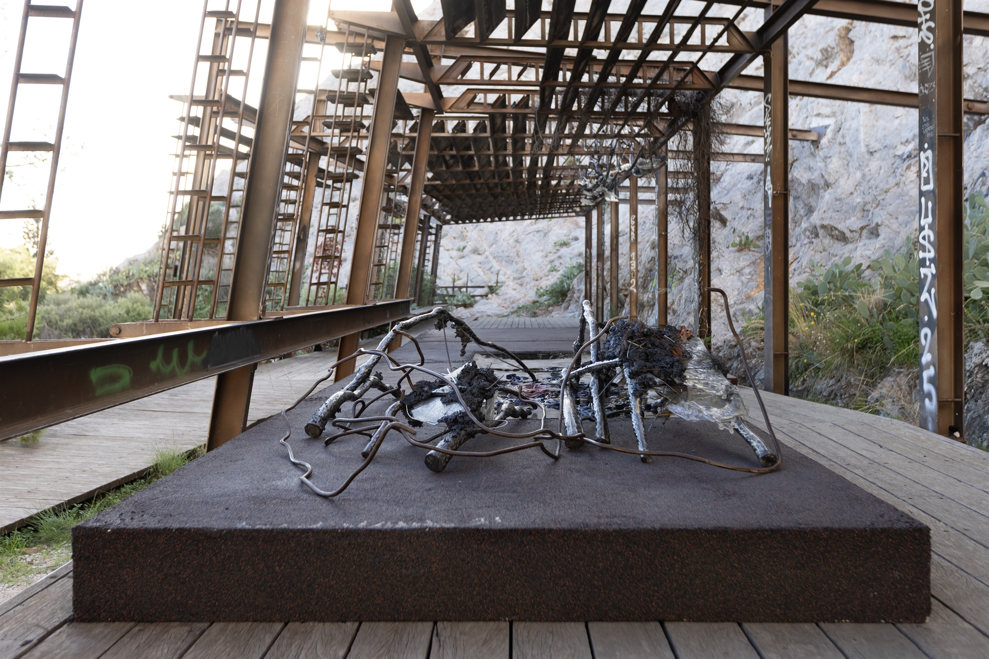 Και η αλήθεια είναι πως όσο διαρκεί η ξενάγηση, έχουν περάσει δίπλα μας δρομείς, φιλόζωοι που βγάζουν βόλτα τον σκύλο τους, περιπατητές και μαμάδες με τα μωρά τους σε καροτσάκια. Το παλιό λατομείο, ένας τόπος φυσικός αλλά ταυτόχρονα διαμορφωμένος από την ανθρώπινη επέμβαση, φέρει ήδη πολλαπλές επιστρώσεις. Το 2003, οι αρχιτέκτονες Μπούκη Μπαμπάλου-Νουκάκη και Αντώνης Νουκάκης δημιούργησαν εκεί μια διάτρητη μεταλλική κατασκευή για υπαίθριες εκθέσεις γλυπτικής, η οποία δεν χρησιμοποιήθηκε ποτέ αλλά έμεινε «δεμένη» στον βράχο, πλέον ως τμήμα του. Πάνω σε αυτόν τον σκελετό, ο Τζάννης προσαρτά το νέο έργο του, επαναφέροντας την αρχική πρόθεση αλλά ταυτόχρονα υπονομεύοντάς την.