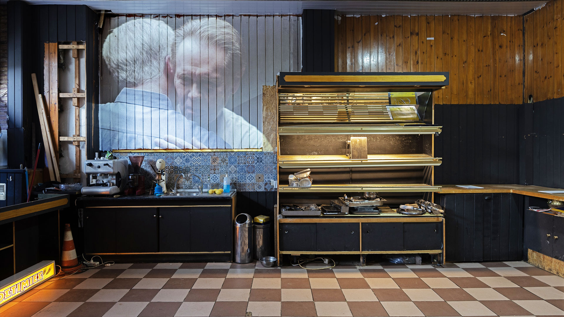 Το βίντεο όμως που δίνει τον τόνο στην έκθεση είναι αυτό που σε υποδέχεται στην είσοδο του μαγαζιού από τον Ιβάν Αργκότε, το οποίο απεικονίζει δύο λευκούς μεσήλικες άνδρες να αγκαλιάζονται – ένα σχόλιο για την ανδρική ταυτότητα, ίσως αυτό το ξάφνιασμα που μπορεί να αισθάνονται όταν καλούνται οι άνδρες να επαναπροσδιορίσουν τον εαυτό τους πέρα από αυτό που κάνουν. «Κάθε μέρα που έρχομαι, ακόμα και τώρα που έχουμε στήσει, βλέπω κάτι στον τοίχο· πάει ο πατέρας μου και βάζει ένα ρολόι, μια παλιά αφίσα, κρεμάει ένα ημερολόγιο. Το κατεβάζω και του λέω “τι κάνεις; έχουμε στήσει, θα έρθει φωτογράφος”. Και μου λέει “εντάξει τώρα, για λίγο, να υπάρχει κάτι”. Οταν έφυγαν τα μεγάλα ψυγεία και ο φούρνος, πήγαινε και τοποθετούσε τραπέζια στη θέση τους, να αναπληρώσει τους όγκους, να διατηρήσει την κάτοψη σχεδόν ίδια. Υπάρχει αυτός ο φόβος, να μην αδειάσει ο χώρος – είναι και αυτό κομμάτι του πένθους, της συμφιλίωσης με μια διάδοχη κατάσταση», εξηγεί ο Ανέστης για τον πατέρα του.
