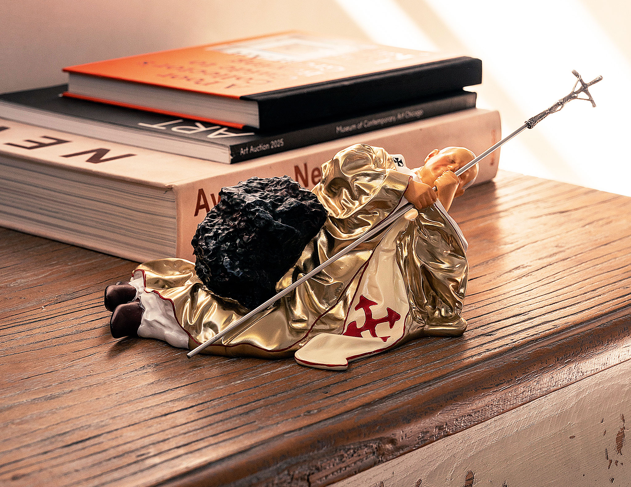 Το έργο που επανέρχεται σήμερα σε μινιατούρα 30 εκατοστών δεν είναι τυχαίο. Το «La Nona Ora», που πρωτοπαρουσιάστηκε το 1999, απεικονίζει τον Πάπα Ιωάννη Παύλο Β΄ πεσμένο στο κόκκινο χαλί, χτυπημένο από μετεωρίτη. Ηταν ένα γλυπτό που δίχασε, προκάλεσε, συζητήθηκε όσο λίγα και πωλήθηκε το 2001 στον οίκο Christie’s για 886.000 δολάρια. Βλάσφημο ή βαθιά συμβολικό, σίγουρα υπήρξε ένα χαρακτηριστικό δείγμα της ικανότητας του Κατελάν να προκαλεί. Η νέα έκδοση, σε –καθόλου τυχαία– 666 αριθμημένα αντίτυπα, ζωγραφισμένα στο χέρι κοστίζει 2.200 ευρώ και διαθέτει την ίδια δόση ειρωνείας που έκανε το αρχικό έργο διάσημο.