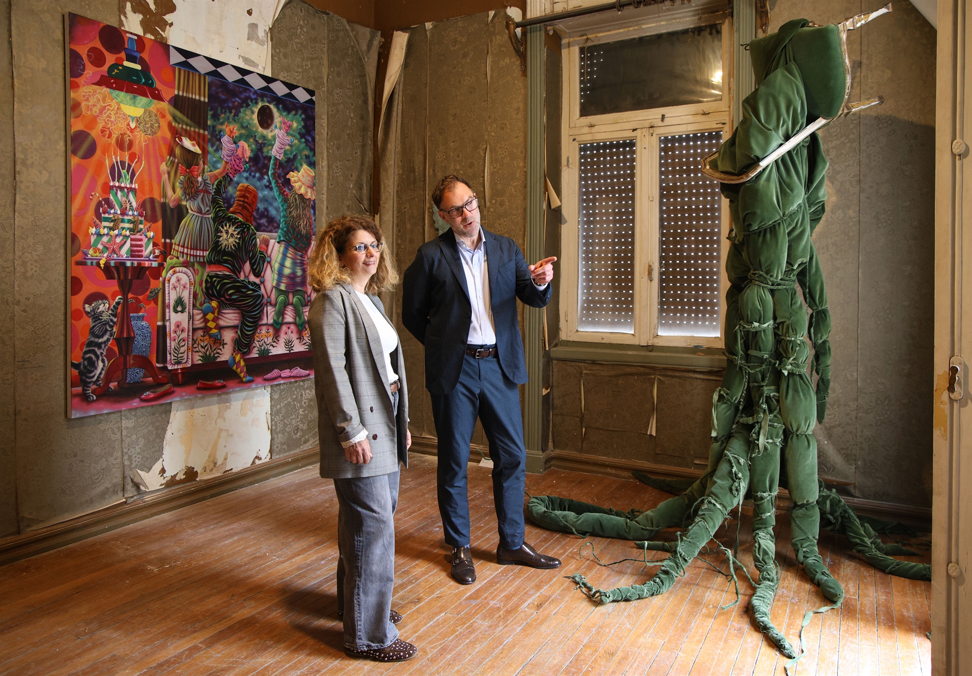 «Η κατεύθυνση που δώσαμε στους καλλιτέχνες που έφτιαξαν ή δάνεισαν έργα για την έκθεση ήταν να μας δείξουν μια άλλη, λιγότερο γνωστή πτυχή του έργου τους, ένα κρυφό project, κάτι που δουλεύουν στο στούντιο χωρίς να έχουν απαραίτητα στον νου τους να εκθέσουν. Ηθελα να μας ξαφνιάσουν, με τον ίδιο τρόπο που σε ξαφνιάζει αυτό το σπίτι», σημειώνει η κ. Κοσμαδάκη. Απέναντι από το έργο του Παπαηλιάκη υπάρχει ένα υφαντό γλυπτό της Τάμι Κανάτ, μιας καλλιτέχνιδος από την Αυστραλία που ο Γερμανός art advisor αγαπά ιδιαίτερα, ενώ δίπλα, στην αίθουσα του «πάρτι» όπως την αποκαλούν, ξεχωρίζει το ζωγραφικό της Ιωάννας Λημνιού με σχετικό τίτλο («Purple Party»), το μπαλόνι του Γέπε Χάιν, αλλά και το κολάζ από βινύλια του Χίλντεμπραντ. Στο κέντρο αυτού του δωματίου δεσπόζει μια κατασκευή από καρέκλες που βρήκε στο διαμέρισμα η Πολίνα Μήλιου και τις έντυσε με foam. «Μόνο να εικάσουμε μπορούμε τη χρήση κάθε δωματίου», εξηγεί η Ελληνίδα επιμελήτρια. Σε αυτό που φαντάστηκαν και οι δύο επιμελητές ότι μπορεί να φιλοξενούσε τα παιδιά μιας οικογένειας τοποθέτησαν ένα έργο του Παναγιώτη Λουκά με αναφορές σε πλάσματα της φαντασίας και ένα δέντρο με μεγάλες ρίζες και κορμό από πράσινο βελούδο της Μάρως Μιχαλακάκου. Δίπλα σε αυτό το δωμάτιο, που σκέφτομαι πως μάλλον θα λειτουργούσε ως γραφείο, βρίσκεται ένα έργο των Αnacolutha (Μαλβίνα Παναγιωτίδη και Εύα Βασλαματζή), στο οποίο οι δύο καλλιτέχνιδες έχουν συμπεριλάβει ηχητικά αποσπάσματα από τους «Προσανατολισμούς» του Ελύτη και ένα όνειρο του ποιητή. Το έργο μοιάζει να ανοίγει διάλογο με άλλες ρωγμές στον χρόνο: με πολαρόιντ και σχέδια του Γιάννη Βαρελά και ένα ζωγραφικό της Νικομάχης Καρακωστάνογλου από τα χρόνια που πέρασε στην Κίνα. Ανεβαίνοντας μια στενή ξύλινη σκάλα, οδηγούμαστε στο πάνω επίπεδο και στο πλυσταριό. Μπροστά από μια μεγάλη σκάφη διακρίνονται τα λιτά ασπρόμαυρα κεντήματα της Σεβαστιάνας Κωνστάκη και στον διπλανό χώρο μια εντυπωσιακή εγκατάσταση της Ιωάννας Πανταζοπούλου από σανδάλια, ένα σχόλιο στον τουρισμό που έχει αλώσει αυτήν την πόλη. «Αυτός ο χώρος είναι σε μετάβαση, εμπεριέχει την ιστορία του, τις φθορές του χρόνου, τις ροζέτες στο πάτωμα, τα παλιά σκεύη και τους μαρμάρινους νιπτήρες, και το αύριο, αυτό που θα γίνει, αυτό που ελπίζουμε να γίνει», αναφέρει ο Ματίας Αρντ.