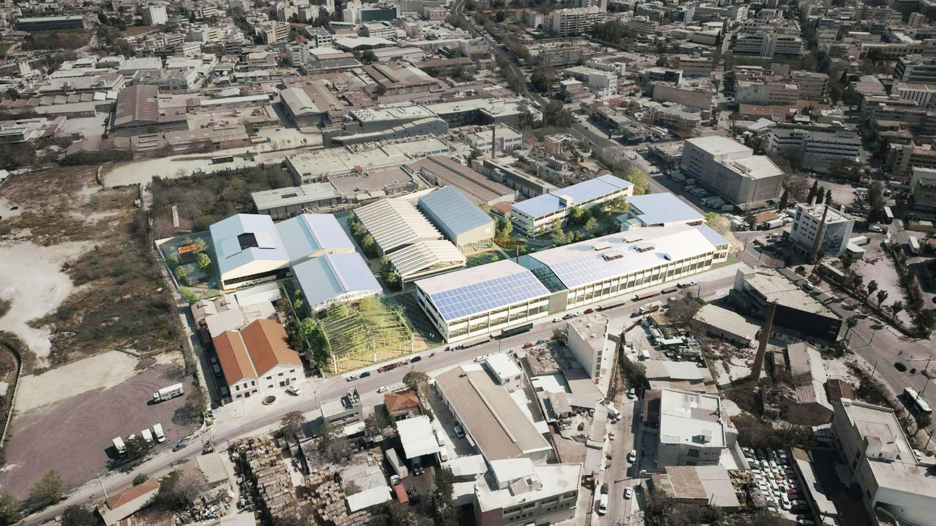 Πώς θα υλοποιηθούν όλα αυτά; Με κατεδαφίσεις δευτερευόντων κτισμάτων και διανοίξεις περασμάτων, σε υφιστάμενους κτιριακούς όγκους, σχεδιάζεται ένα δίκτυο κινήσεων και θεάσεων τόσο στο εσωτερικό του βιομηχανικού συγκροτήματος, αλλά και στη σχέση του με την πόλη. Ο φιλόδοξος στόχος είναι ο ελεύθερος χώρος ανάμεσα στα κτίρια να δίνει την εντύπωση ότι έχει καταληφθεί από τη φύση, καθώς προβλέπονται φυτεύσεις δένδρων, ενώ θάμνοι και πόες θα καλύπτουν συνολικά έκταση πάνω από 2.000 τ.μ. Διαμορφώνεται δηλαδή ένα είδος πάρκου με τοπικές πυκνώσεις και αραιώσεις στη βλάστηση, ικανό να φιλοξενεί ποικίλες εκδηλώσεις. Η παρέμβαση του πρασίνου ολοκληρώνεται με τη δημιουργία ενός τρισδιάστατου/κατακόρυφου κήπου με αναρριχητικά φυτά, που αξιοποιεί τον φέροντα οργανισμό του βιομηχανικού κελύφους. Ο υπάρχων βιομηχανικός εξωτερικός χώρος διατηρεί τον χαρακτήρα του, ενώ παράλληλα, με τη χρήση φυσικών, απλών υλικών, μεταλλάσσεται σε χώρο συνάντησης και εκδηλώσεων. Στόχος είναι η ενεργειακή ανεξαρτησία του συγκροτήματος μέσα από την αξιοποίηση της ηλιακής και γεωθερμικής ενέργειας και η ενεργειακή του πιστοποίηση ως «πράσινου».