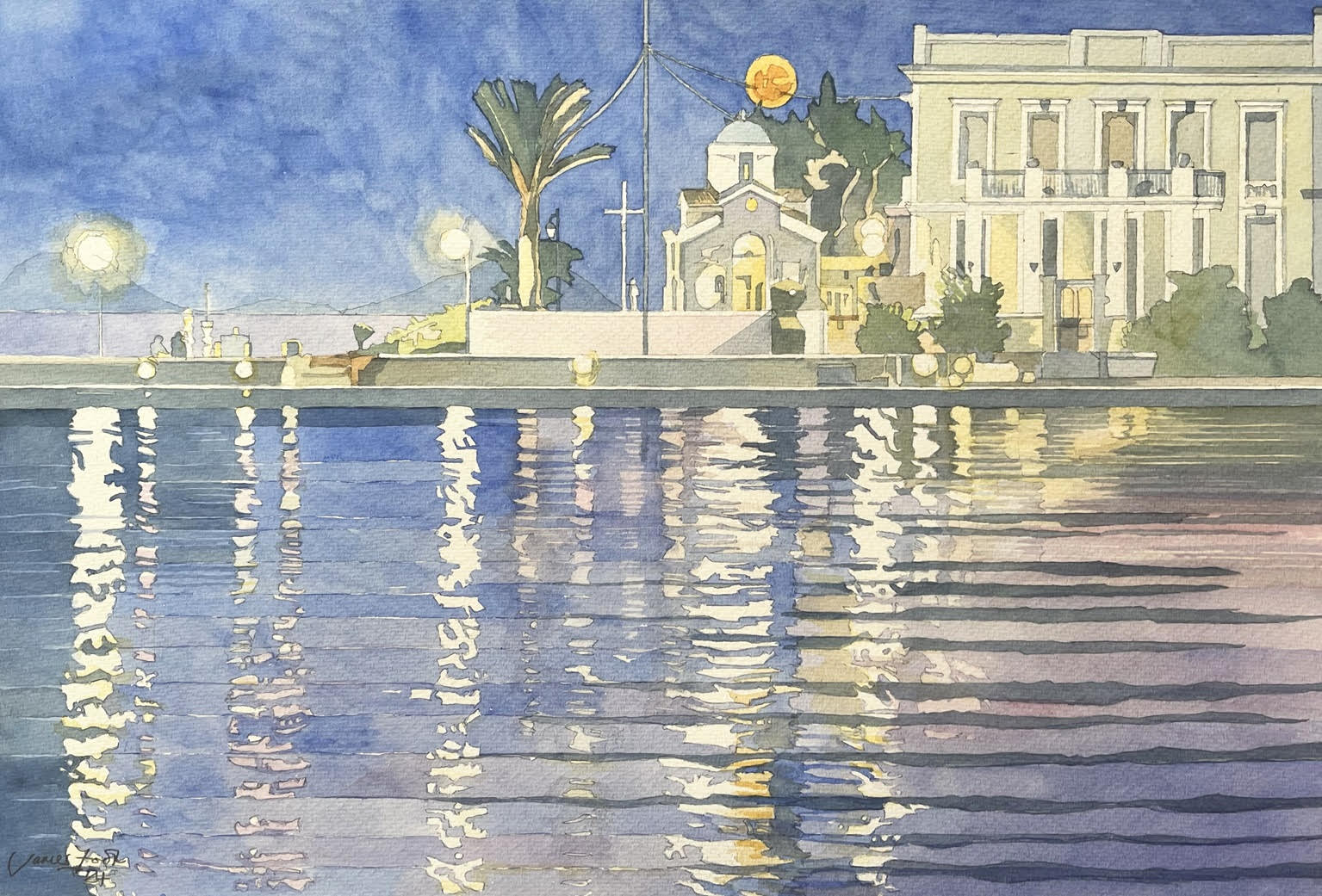 Φέτος το καλοκαίρι αποφάσισε να κάνει μια διπλή έκθεση, τόσο στον τόπο κατοικίας του όσο και στο νησί του Αργοσαρωνικού όπου πρωτοαγάπησε την Ελλάδα. Εκεί στο Ορλόφ στο Παλιό Λιμάνι θα δείξει έως τα τέλη Αυγούστου μια σειρά από καινούργιες υδατογραφίες του, που υμνούν τη σπετσιώτικη γοητεία της φύσης. Στο ίδιο αφιέρωμα έχει ενθέσει κι άλλες εικόνες που του έχουν εγγραφεί στη μνήμη, όπως μια ωραία μυκονιάτικη εκκλησία, καθώς και αρχαιολογικά σπαράγματα και μια ελιά που είδε στον χώρο της Αρχαίας Μεσσήνης. Πήγε στο εκεί αρχαίο θεατράκι για μια μουσική εκδήλωση και μαγεύτηκε με τον τόπο που ανέστησε ο αείμνηστος Πέτρος Θέμελης.