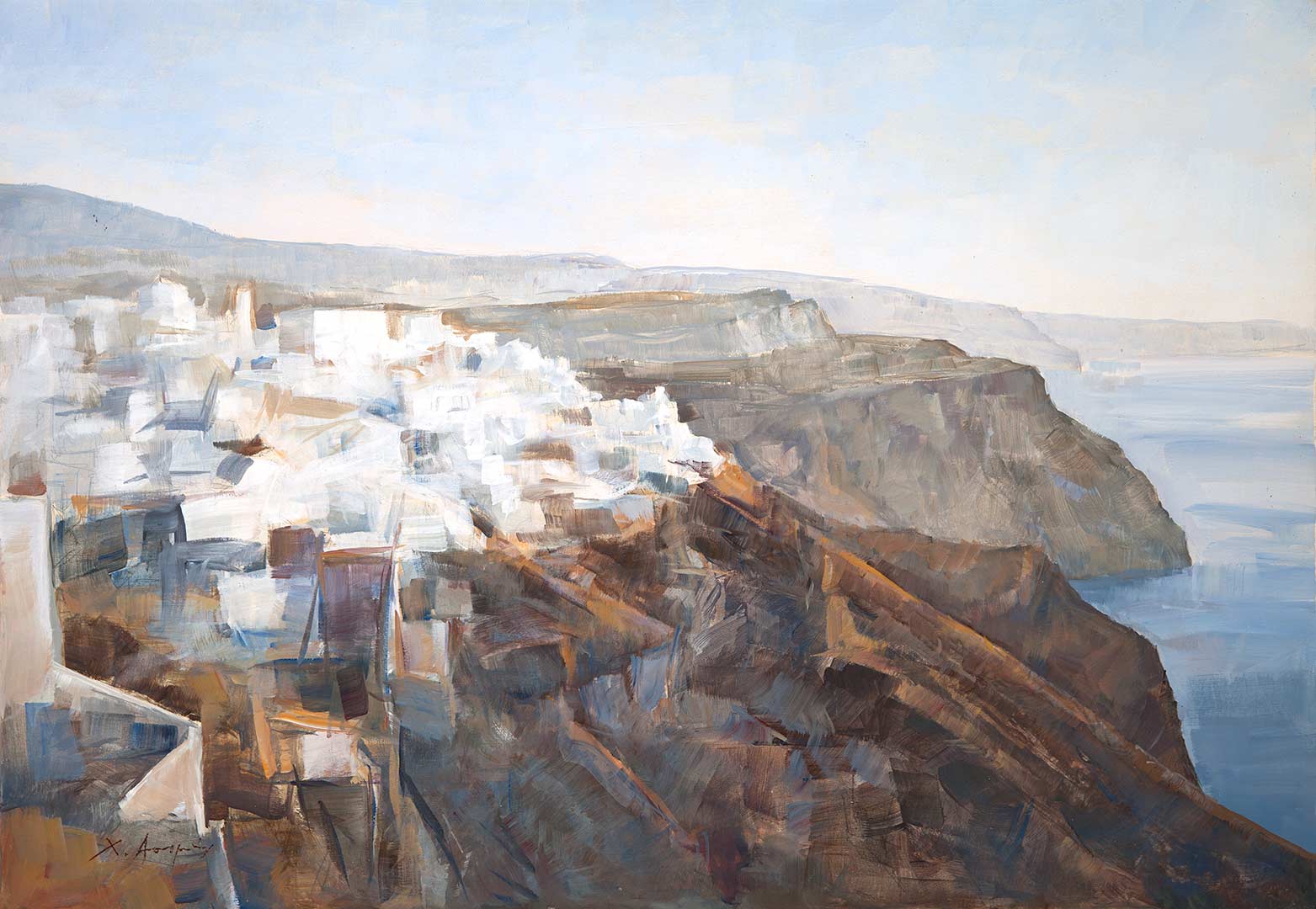 Υπάρχει κάτι δυσκολότερο από το να ζωγραφίσεις τη Σαντορίνη; Είναι τέτοια η ενέργεια του νησιού, οι ψυχικές δονήσεις που διαπερνούν το ανθρώπινο σώμα όταν βρεθεί αντιμέτωπο με το δέος της Καλντέρας, που χρειάζεται θάρρος για έναν καλλιτέχνη. Ο Χριστόφορος Ασιμής μπορεί και αποτυπώνει το νησί επειδή γεννήθηκε εκεί και του αφιερώθηκε πλήρως, είναι σαρξ εκ της σαρκός του. Εμαθε να περπατά στα λευκά σοκάκια, είδε όλα τα ηλιοβασιλέματα, γνώρισε τη μανία του ανέμου, την ηφαιστειακή τέφρα της θηραϊκής γης, αναγκάστηκε να φύγει λόγω του μεγάλου σεισμού του ’56. Γνώρισε επίσης και την αλλοτρίωση που υφίσταται ο τόπος από τότε που έγινε έρμαιο του μαζικού τουρισμού. Ισως αυτό να ήταν που τον έκανε να θέλει να επιστρέψει στις ρίζες, με μια έκθεση που παρουσιάστηκε πριν από λίγες ημέρες. Τίτλος της «Η Σαντορίνη που δεν γνώρισα», εμπνευσμένη από παλιές ασπρόμαυρες φωτογραφίες που αναρτούν στο Διαδίκτυο ο αρχαιολόγος και ξενοδόχος Λευτέρης Ζώρζος και ο Μιχάλης Πελέκης.