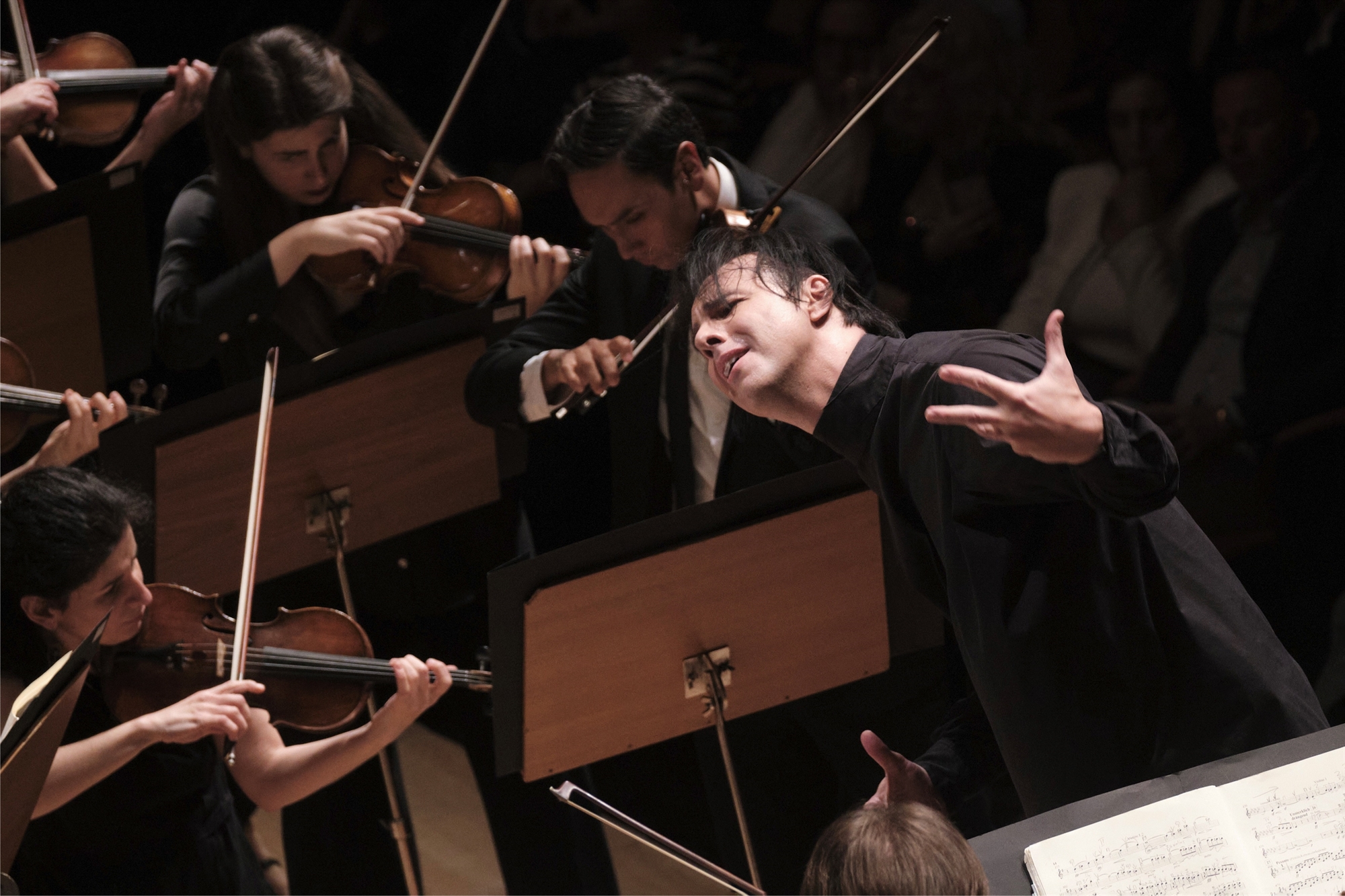 Ο Κουρεντζής δεν διαμεσολαβεί μόνο για να καταλάβουμε και να αισθανθούμε συνθέτες όπως ο Μπετόβεν ή ο Μπαχ. Το πρώτο μέρος της βραδιάς αφιερώθηκε στον Γερμανοαμερικανό Τζέι Σβαρτς (1965). Τίτλος της σύνθεσης «Passakaglia» (μουσική φόρμα της εποχής του μπαρόκ), που όμως αναφερόταν απολύτως στον 21ο αιώνα για να σχολιάσει το ζήτημα της μετανάστευσης και της συνεχόμενης αναζήτησης ταυτότητας. Γράφτηκε για τον Κουρεντζή και τη Utopia Orchestra, κάνοντας πρεμιέρα στη Φιλαρμονική του Βερολίνου στα τέλη Οκτωβρίου. Σίγουρα, κάθε ακροατής βάζει άλλες εικόνες στη μουσική που ακούει, αλλά οι επαναλαμβανόμενες νότες του Σβαρτς με έκαναν να νιώθω ότι για 25 λεπτά ήμουν σε ένα αεροπλάνο που αγκομαχούσε στον αέρα. Σαν να άκουγε κανείς συνεχώς θορύβους από μηχανές, σφυρίγματα διαφορετικών πιέσεων, σειρήνες. Ηταν γοητευτικά τρομακτικό, αλλά και τρομακτικά γοητευτικό την ίδια στιγμή. Ενας παλλόμενος βόμβος που αντανακλά τον κόσμο μας ο οποίος δοκιμάζεται από πολέμους και κρίσεις, αναγκάζοντας εκατομμύρια ανθρώπους να αναζητούν αλλού στέγη. Ο ίδιος ο Κουρεντζής στις κινήσεις του επάνω στο πόντιουμ θύμιζε πτηνό με μακριά μαύρα φτερά. Αφότου ακούστηκε και η τελευταία νότα, έπεσε για δευτερόλεπτα μια βαθιά σιγή στην αίθουσα, ωστόσο τα δάκτυλα του αριστερού του χεριού συνέχιζαν να κουνιούνται σαν ο ίδιος να άκουγε κάτι που εμείς αδυνατούσαμε να αφουγκραστούμε.
