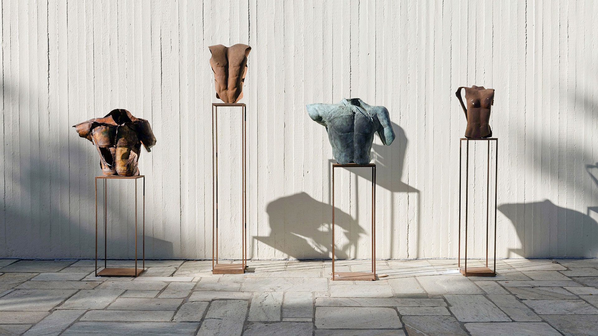 «Θώρακες» από μέταλλο που μοιάζουν με σπασμένα αγάλματα, με σώματα που ίσως ανήκουν σε ήρωες ή σε θεούς. «Μνήμες» φτιαγμένες από ξύλα που ξεβράζει η θάλασσα, και καθώς στέκονται πάνω στις μεταλλικές ή ξύλινες βάσεις τους μοιάζουν με ξόανα ή Ερινύες, σύμβολα προστασίας ή τιμωρίας. «Αλογα» που τριποδίζουν ελεύθερα, ή στέκονται εξημερωμένα δίπλα στον άνθρωπο.