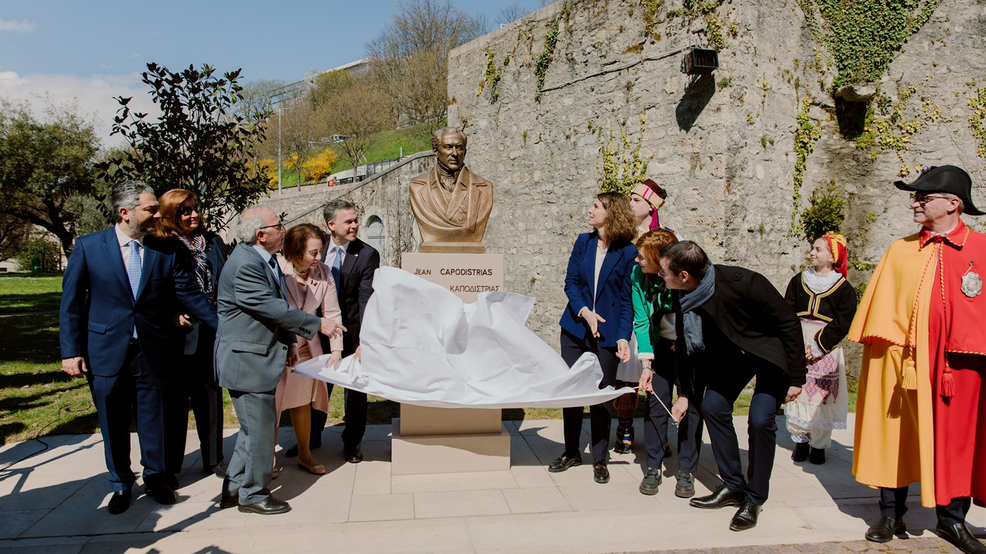 Ωστόσο, η κορύφωση της εθνικής υπερηφάνειας ήρθε λίγες ημέρες αργότερα, ανήμερα της εθνικής μας εορτής. Ακόμη και ο καιρός ομονόησε ώστε να φωτίσει με αχτίδες ήλιου τα αποκαλυπτήρια της προτομής του Ιωάννη Καποδίστρια –μια περίτεχνη προτομή διά χειρός του Τήνιου Πραξιτέλη Τζανουλίνου–, που τοποθετήθηκε στο πιο επίζηλο σημείο της πόλης, ως αποτέλεσμα μιας επίμονης και συστηματικής προσπάθειας του Γενικού Προξενείου και της ελληνικής παροικίας. Πρόκειται για το παλάτι του σπουδαίου Ελβετού φιλέλληνα Ιωάννη Γαβριήλ Εϋνάρδου, στενού φίλου του Κερκυραίου, ένα εμβληματικό κτίριο που ταυτίζεται με τον φιλελληνισμό της πόλεως. «Επειτα από περίπου δύο αιώνες ο Ιωάννης Γαβριήλ ανταμώνει και πάλι με τον επιστήθιο φίλο του, Ιωάννη», ανέφερε στην ομιλία του ο δραστήριος γενικός πρόξενος Αλέξανδρος Γεννηματάς, εκφράζοντας την υπερηφάνεια και τη χαρά της ελληνικής παροικίας, καθώς μια προσπάθεια περίπου 30 ετών επιτέλους έφτασε στο τέλος της, ενώ χαιρέτισε και τη σημαντική συμβολή του προκατόχου του, Θάνου Καφόπουλου. «Η προτομή αυτή αποτελεί δωρεά του Ελληνισμού της Γενεύης και είναι ένας οφειλόμενος φόρος τιμής σε μια προσωπικότητα που διαδραμάτισε αποφασιστικό ρόλο στην ιστορία των δύο χωρών, αλλά και της Γενεύης ειδικότερα.