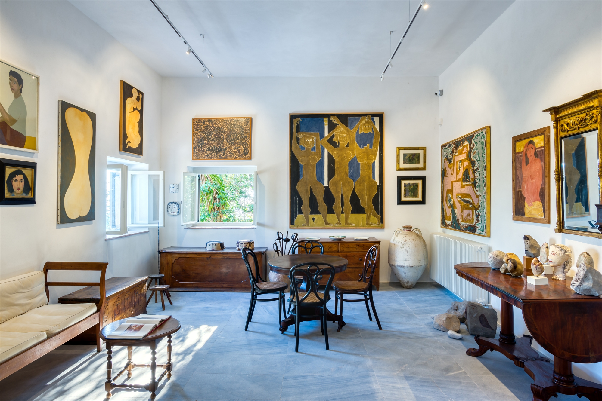 Εκεί στα Πλακάκια στήθηκε μια ολόκληρη κοινότητα. Την αρχή έκανε ο Νικολάου, μαγεμένος από το φως, για να ακολουθήσει ο Καπράλος. Εσμιξαν με τον Τάκη Καλμούχο, τον Νίκο Καζαντζάκη και τόσους ακόμη ανθρώπους του πνεύματος που είχαν προηγηθεί. Ο Μόραλης ακολούθησε. Ο Νικολάου από το 1964 εγκαταστάθηκε μόνιμα στο νησί. Στο σπίτι αυτό του Νίκου και της Αγγέλας «το ανοιχτό όλες τις ώρες, ανάμεσα στις ελαιογραφίες, τις νωπογραφίες και τα γλυπτά και τις λίθινες ενθέσεις, βρήκαν επίσης –λίγα χρόνια αργότερα– θέση περίβλεπτη οι ζωγραφισμένες πέτρες. Πέτρες που ο Νικολάου μάζευε προσεκτικά από την Αίγινα, την Επίδαυρο και αλλού, πέτρες που έγιναν πρόσωπα με μάτια τεράστια σαν φαγιούμ, πέτρες που έγιναν γυναικεία κορμιά κι ερωτικά συμπλέγματα του θέρους», τονίζει η επιμελήτρια. «Πηγαίνοντας μαζί μας και με τα άλλα του ανίψια απέναντι, στην Επίδαυρο», αφηγούνται η Δάφνη και ο Θοδωρής Ζουμπουλάκης, «στεκόταν στον ήλιο και κοιτούσε τις πέτρες, τις σήκωνε, τις εξέταζε, τις ακουμπούσε πάλι κάτω απαλά, σε μια διαδικασία που κρατούσε για ώρες, αφήνοντας εμάς εξαντλημένους και διαλέγοντας εντέλει μία μία μερικές από τις εκατοντάδες που είχε μελετήσει. Επέστρεφε και τις ζωγράφιζε».