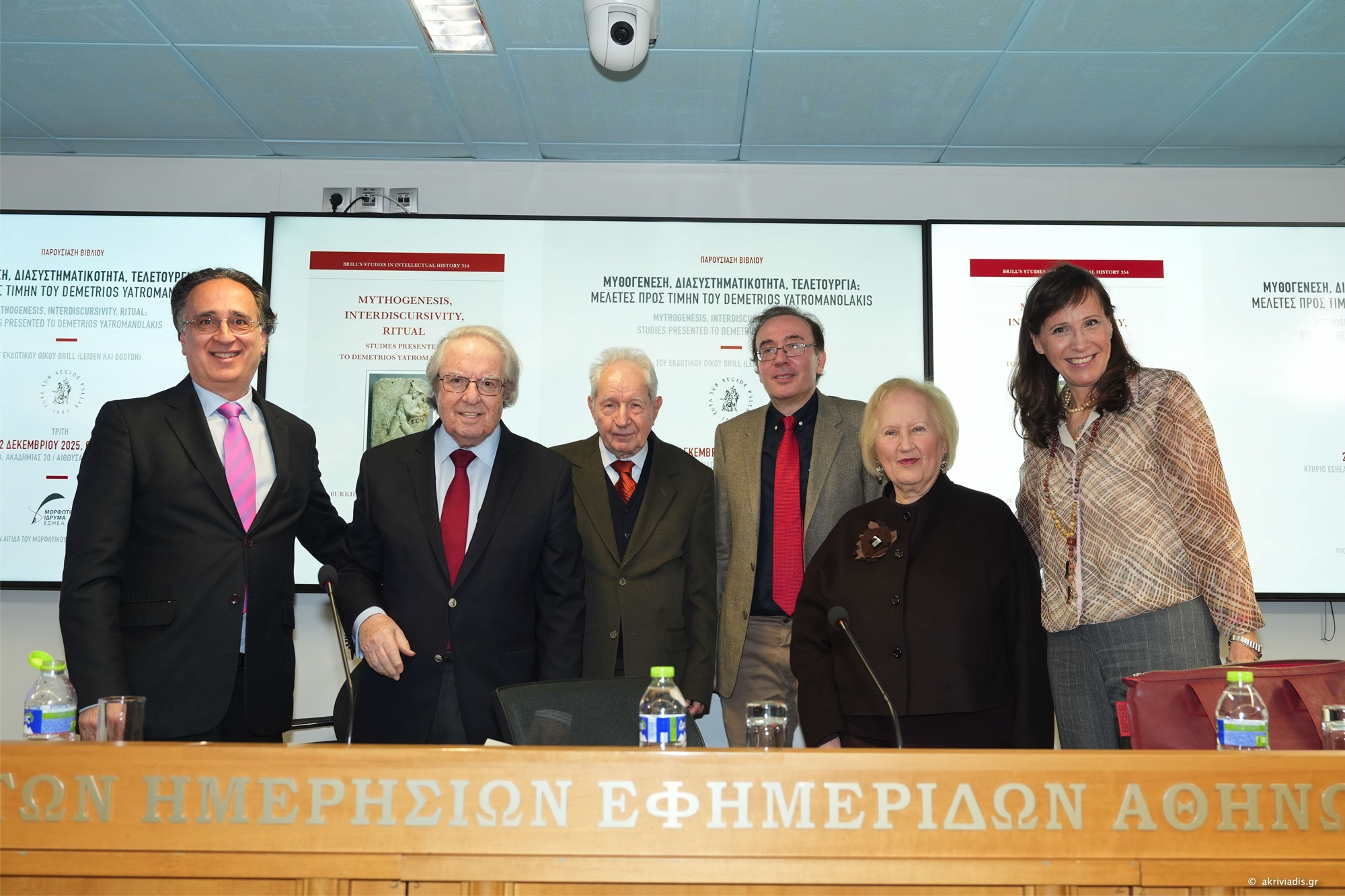 Στην αίθουσα «Γεώργιος Καράντζας» της ΕΣΗΕΑ έγινε η παρουσίαση του τόμου «Μυθογένεση, Διασυστηματικότητα, Τελετουργία: Μελέτες προς τιμήν του Demetrios Yatromanolakis (Mythogenesis, Interdiscursivity, Ritual: Studies Presented to Demetrios Yatromanolakis)», σε επιμέλεια των πανεπιστημιακών Μπούρκχαρντ Φερ, επιφανούς αρχαιολόγου και Παναγιώτη Ροϊλού, καθηγητή Ελληνικών Σπουδών και Συγκριτικής Λογοτεχνίας στο Χάρβαρντ, από τη σειρά Brill’s Studies in Intellectual History του εμβληματικού εκδοτικού οίκου Brill (Leiden και Boston). Μια τέτοια έκδοση συνήθως αφορά επιστήμονες που έχουν φύγει από τη ζωή, είτε βρίσκονται στη δύση της καριέρας τους και σπανιότατα αφιερώνεται σε κάποιον που έχει μπροστά του χρόνια προσφοράς στην επιστήμη.