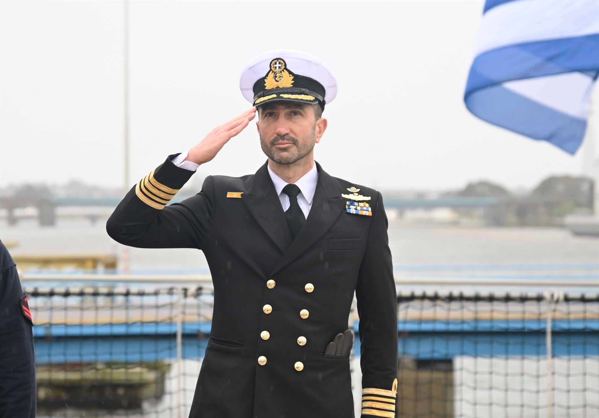 Τη μεγαλύτερη, ωστόσο, συγκίνηση βιώσαμε στη γέφυρα του πλοίου παρουσία του 45άρη κυβερνήτη Ιωάννη Κιζάνη, όταν ο νονός του πλοίου, που ήρθε με πολλά μέλη της οικογένειας και κυρίως κάποια από τα εγγόνια του, έδωσε ένα εξόχως εμβληματικό δώρο: ένα ναυτικό όργανο –τον διπαράλληλο– του ναυάρχου Κουντουριώτη από την περίοδο του θωρηκτού «Αβέρωφ» και των Βαλκανικών Πολέμων που χάρισαν στην Ελλάδα τα νησιά του Βορείου Αιγαίου και τις μεγαλύτερες ναυτικές νίκες της σύγχρονης ιστορίας, που έκλεισαν τους Τούρκους στα Δαρδανέλλια. Από εδώ και στο εξής, όπως είπε ο υποναύαρχος ε.τ. Πάνος Λασκαρίδης, αυτό το αντικείμενο θα βρίσκεται κοντά στα σύγχρονα ναυτικά όργανα και θα θυμίζει στο πλήρωμα ότι το Πολεμικό Ναυτικό μας, που ουδέποτε υπέστειλε τη σημαία του, έχει στελέχη που συνεχίζουν μια ένδοξη ιστορία. Καλοτάξιδος ο «Κίμων» και ο Αγιος πάντα στην πλώρη του.