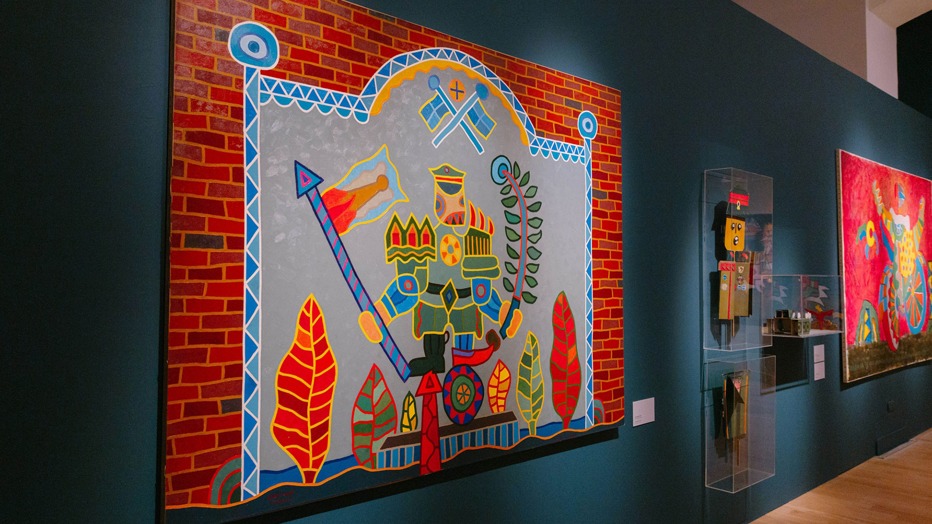 Στο ισόγειο του μουσείου ανακαλύπτει κανείς εκ νέου το ζωγραφικό σύμπαν του με τα γνώριμα μοτίβα. Μάτια και καρδιές, βέλη και τόξα, βαλίτσες, καραβάκια, κύματα και άλλα. Από κοντά και οι χαρταετοί, η σειρά με το τσίρκο, τα αεροπλάνα, τα λουλούδια στους αυτόχειρες και άλλα που φωτίζουν την κριτική του στάση απέναντι στη σοβαροφάνεια.