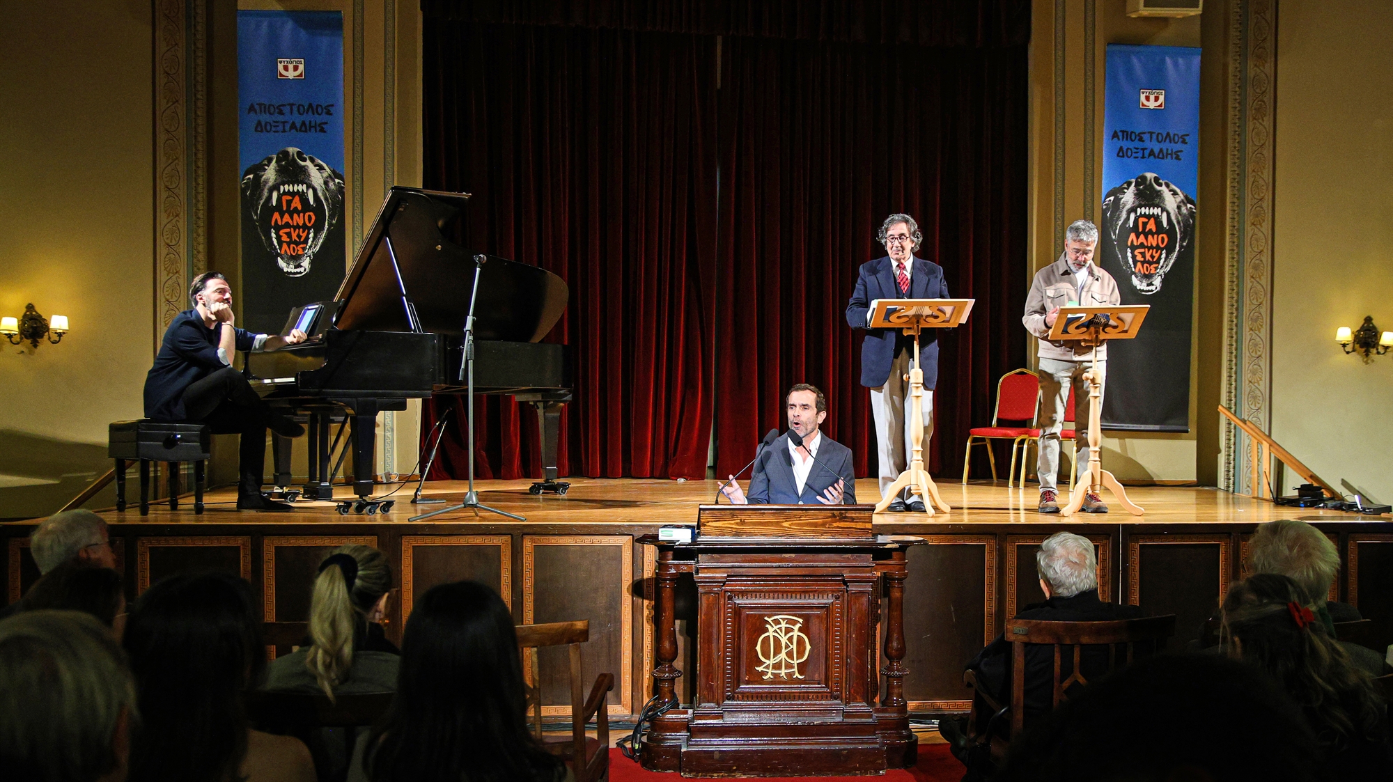 Με αυτόν τον χιουμοριστικό τρόπο άνοιξε τη βραδιά ο Αγγελος Παπαδημητρίου στον κατάμεστο Φιλολογικό Σύλλογο «Παρνασσός», την περασμένη Τετάρτη, για την παρουσίαση του νέου μυθιστορήματος του Απόστολου Δοξιάδη. Εξω η κακοκαιρία «Erminio» έδειχνε τα δόντια της, αλλά μέσα στην αίθουσα όλα τα βλέμματα ήταν στραμμένα στον «Γαλανόσκυλο», που κυκλοφορεί από τις εκδόσεις Ψυχογιός. «Αγγελε, φτάνει, σταμάτα», ακούστηκε από το βάθος της αίθουσας ο Κωνσταντίνος Μαρκουλάκης, ο οποίος είχε αναλάβει τη σκηνοθεσία της περφόρμανς-παρουσίασης. Οπως μας είπε στη συνέχεια, ο Παπαδημητρίου μόλις είχε απαγγείλει με το δικό του χαρακτηριστικό ύφος μια παράγραφο από το βιβλίο, η οποία μάλιστα εκτυλίσσεται μέσα στο ίδιο το κτίριο όπου βρισκόμασταν.