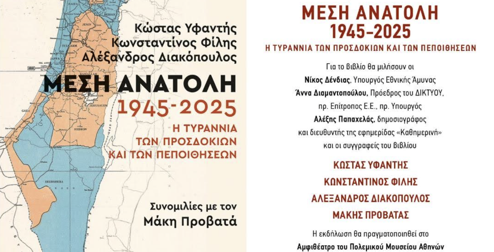 Οι Εκδόσεις Πατάκη σας προσκαλούν την Τετάρτη 21 Ιανουαρίου 2026 στις 19:00 στην παρουσίαση του βιβλίου «Μέση Ανατολή: 1945-2025. Η τυραννία των προσδοκιών και των πεποιθήσεων».