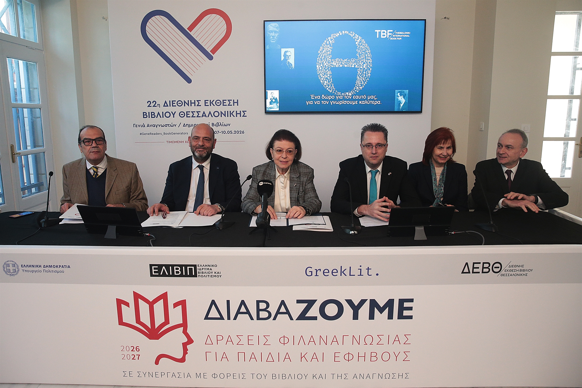 Παρουσιάστηκαν επίσης οι βασικοί άξονες της 22ης Διεθνούς Εκθεσης Βιβλίου Θεσσαλονίκης, που θα πραγματοποιηθεί από τις 7 έως τις 10 Μαΐου, με τιμώμενη χώρα τη Βουλγαρία και με την κεντρική θεματική της διοργάνωσης, «Γενιά Αναγνωστών / Δημιουργοί Βιβλίων», να διερευνά πώς καλλιεργούνται οι νέοι βιβλιόφιλοι. Πρωτίστως βιβλιοφιλική, η θεματική της φετινής ΔΕΒΘ συνδέεται και με το «Ετος Φιλαναγνωσίας» που κήρυξε το ΕΛΙΒΙΠ για την περίοδο 2026-2027 και το οποίο περιλαμβάνει δράσεις ανά την Ελλάδα για παιδιά και εφήβους.