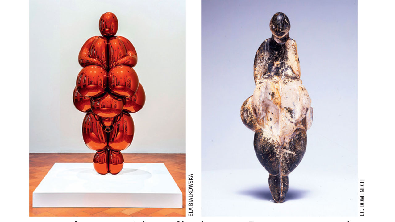 Στο Μέγαρο Σταθάτου, η γυαλισμένη επιφάνεια του γλυπτού από ανοξείδωτο χάλυβα, που συλλαμβάνει φως, κίνηση και ανθρώπινες φιγούρες, θα γειτονεύει στην άλλη αίθουσα του ισογείου με δέκα αντίγραφα παλαιολιθικών ειδωλίων Αφροδίτης, δάνεια από κορυφαία μουσεία της Ευρώπης (ανάμεσά τους το αντίγραφο της θρυλικής Αφροδίτης του Λεσπόγκ, από το Εθνικό Μουσείο Φυσικής Ιστορίας στο Παρίσι). Τα μικρά αυτά ειδώλια –φορητές και συμπαγείς αναπαραστάσεις της γονιμότητας– ενσωματώνουν κάποιους από τους αρχαιότερους αισθητικούς κώδικες της ανθρώπινης ιστορίας. Η συνύπαρξή τους με τη μνημειακή Αφροδίτη του Kουνς ανοίγει ένα διάλογο για το πώς ένα παγκόσμιο αρχέτυπο επιβιώνει στις κοινωνίες του 21ου αιώνα. Η μορφή της Αφροδίτης διατρέχει ολόκληρο το έργο του Κουνς ήδη από τα τέλη της δεκαετίας του ’70. Στη σειρά «Antiquity», ο καλλιτέχνης συνδέει την προϊστορική απλότητα με ένα πυκνό δίκτυο αναφορών, που εκτείνεται από τον Μποτιτσέλι και τον Τισιανό μέχρι τον Ντισάν και τον Μπρανκούζι. Η μικροσκοπική παλαιολιθική θεότητα μεταμορφώνεται σε ένα σχεδόν ανθρωπομετρικό «μπαλόνι», μέσα από μια επίπονη διαδικασία ετών.