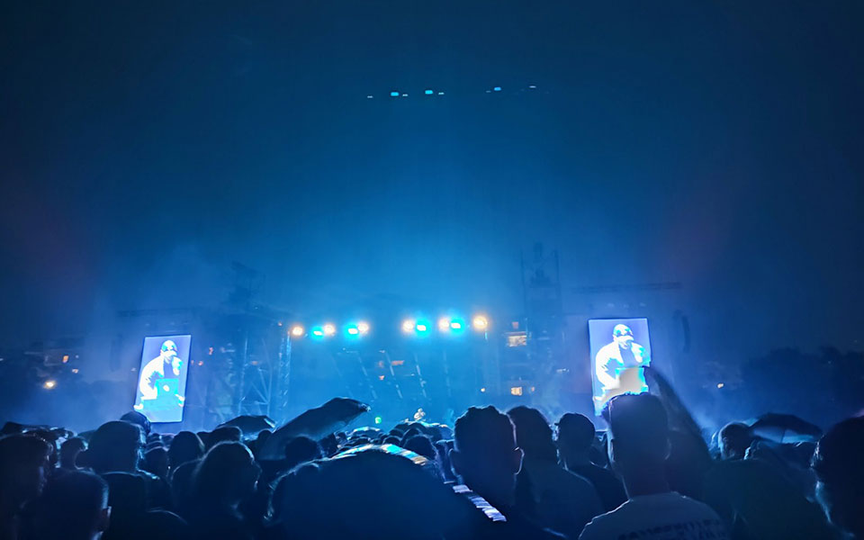 Και κάπου εκεί το ψιλόβροχο που έπεφτε από ώρα δυναμώνει, γίνεται ουράνιος καταρράχτης πάνω στο απροστάτευτο πλήθος. Ομως κανένας δεν νοιάζεται πραγματικά. Οι λιγοστές ομπρέλες έχουν πια κλείσει και τα βρεγμένα πρόσωπα καθρεφτίζουν όσα φτάνουν από τη σκηνή. «Vittorio», «Πολυκατοικίες», «Μπόμπαν», «Air-Max».