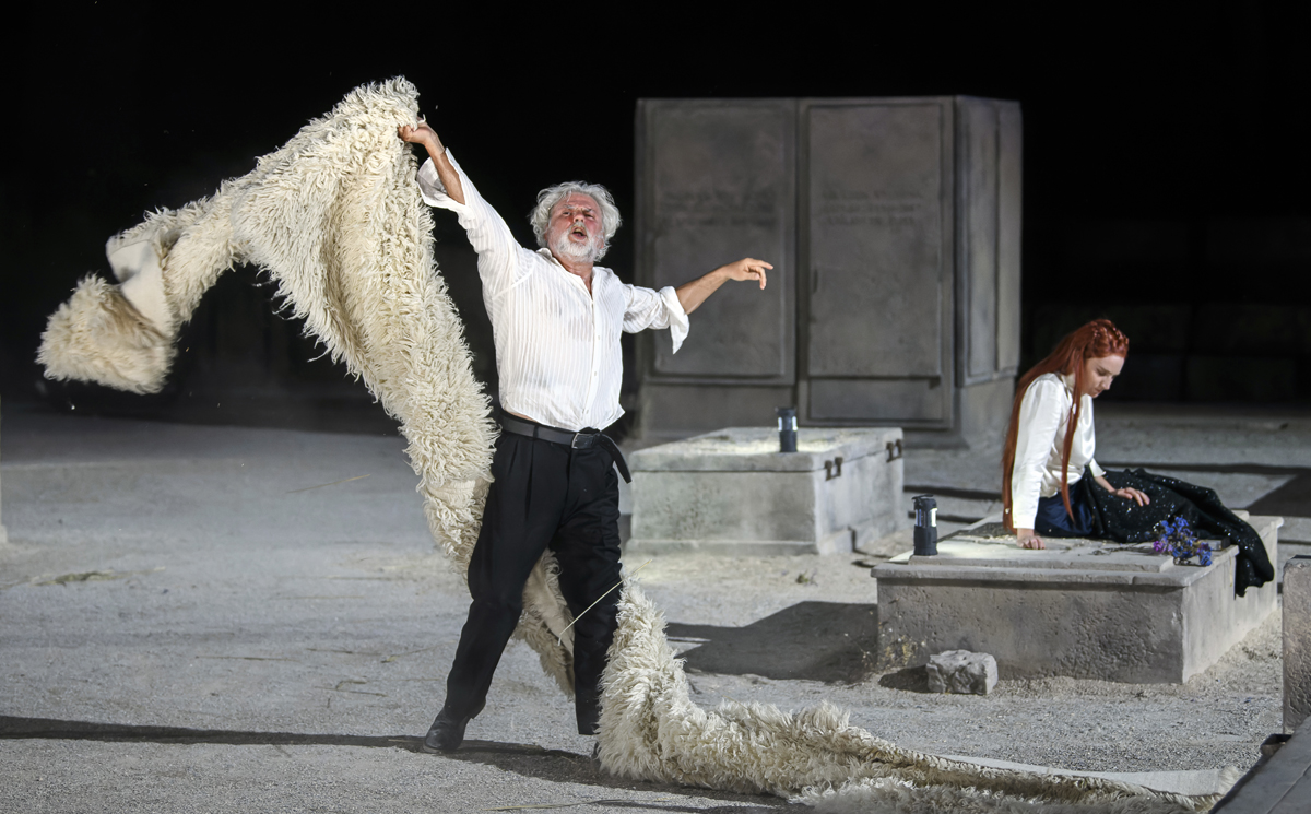 Η ορχήστρα της Επιδαύρου παραπέμπει σε νεκροταφείο ή μικρογραφία νεκρόπολης. Διάσπαρτα στην ορχήστρα βλέπουμε ταφικά μνημεία με επιτύμβιες στήλες και στην άκρη της, ένα εκκλησιαστικό όργανο. Οι τάφοι συνδέονται αρχιτεκτονικά και οπτικά με τα ερείπια πίσω από την ορχήστρα. Πέντε λεπτά πριν από την έναρξη της παράστασης «Οιδίπους», σε σκηνοθεσία Γιάννη Χουβαρδά, τα πέντε μέλη του Χορού εισέρχονται στον σκηνικό χώρο. Είναι φροντιστές του νεκροταφείου, «υπάλληλοι» γραφείου τελετών, αλλά μοιάζουν έντονα και με κάποια «αγγιγμένα από το χέρι του θεού όντα», σαν αυτά που ενδεικτικά παρουσιάζονται στον «Λόγο» του Ντράγιερ ή στο «Οι κοινωνούντες» του Μπέργκαμ, όπως λέει στο σκηνοθετικό του σημείωμα ο Χουβαρδάς. Τοποθετούν κάποια αντικείμενα και ελέγχουν αν όλα είναι έτοιμα προς λειτουργία.