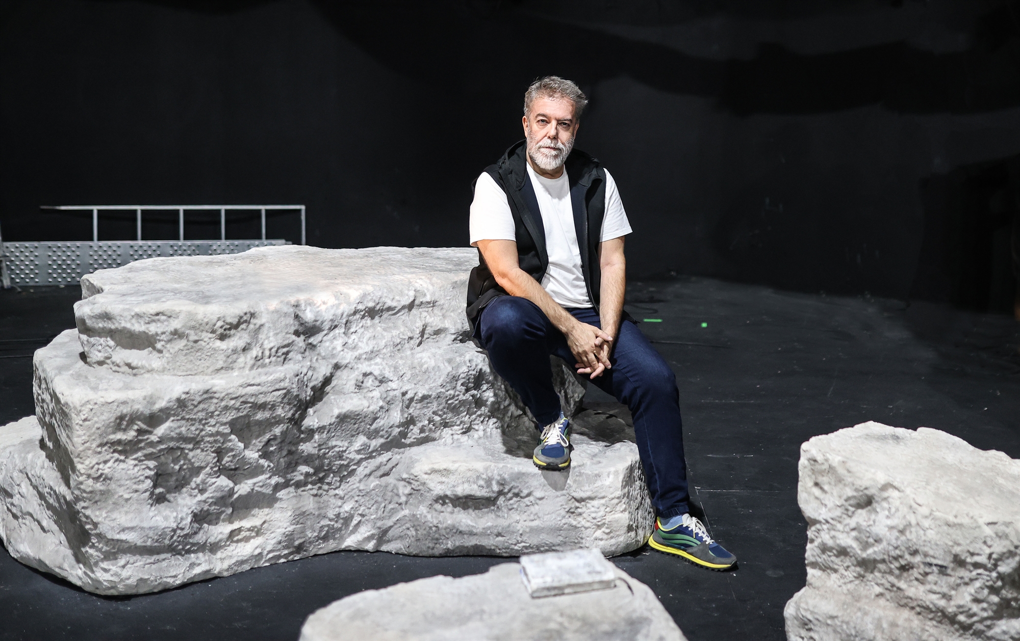 Συζητούμε μετά το τέλος της πρόβας. Είναι χωμένος μέσα σε αναρίθμητα μικροαντικείμενα –τυλιγμένα χαλιά, κουτιά, έπιπλα κι επιπλάκια– που γεμίζουν τη σκηνή. «Είναι σαν πολλές μετακομίσεις σπιτιών μαζί», σχολιάζει, «που τώρα πρέπει να αποκτήσουν σχήμα και μορφή από τη σκηνογράφο μας Μαρία Καραθάνου».