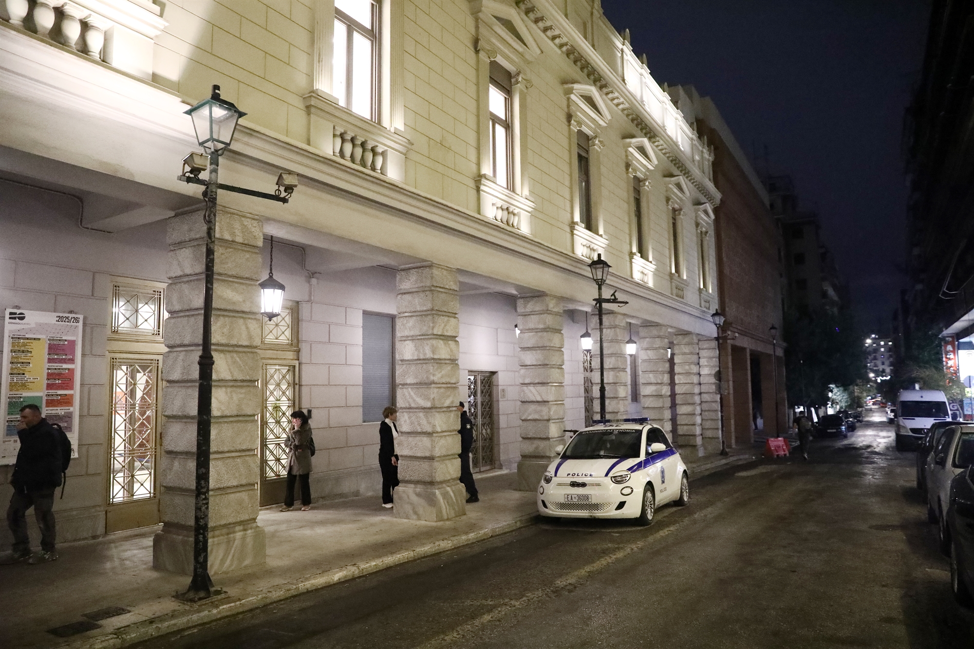 Προχωρημένο απόγευμα Τετάρτης και οι πιο αργοπορημένοι θεατές της παράστασης των 7 επιταχύνουν το βήμα τους μπροστά από την είσοδο του Εθνικού Θεάτρου στην οδό Μενάνδρου. Ενα περιπολικό της Ελληνικής Αστυνομίας, διακριτικά σταθμευμένο λίγο πιο μακριά, φροντίζει η πρόσβαση στην πρώτη σκηνή της χώρας να πραγματοποιείται χωρίς απρόοπτα· κάτι καθόλου αυτονόητο για ορισμένα από τα πιο «δύσκολα» οικοδομικά τετράγωνα σε ολόκληρη την Αθήνα, που περιλαμβάνουν και το κατά τα άλλα λαμπρό συγκρότημα του Ερνέστου Τσίλερ επί της Αγίου Κωνσταντίνου.