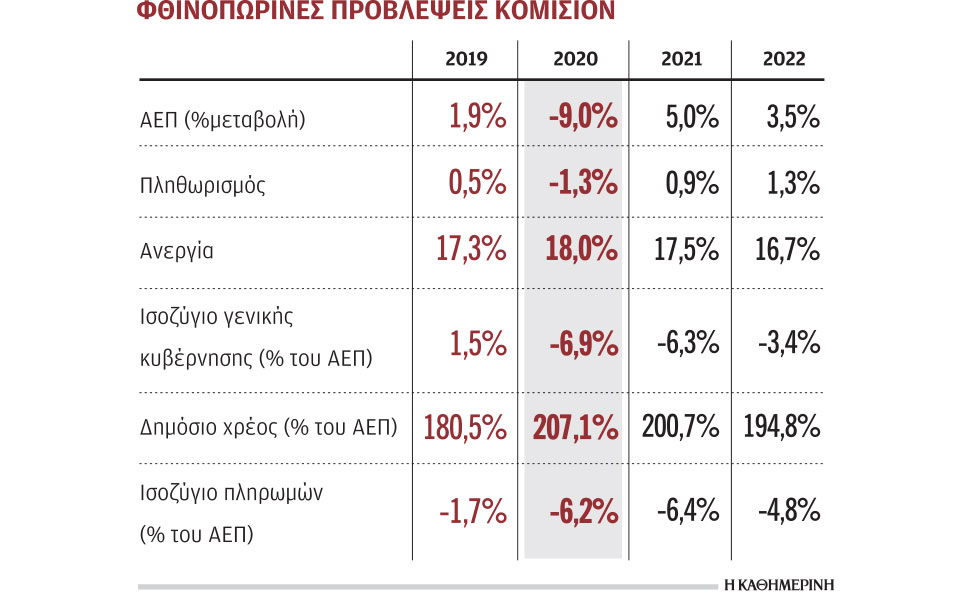 Η ύφεση προβλέπεται στο 9% για φέτος, αλλά προφανώς δεν έχουν ληφθεί υπόψη τα τελευταία μέτρα και το lockdown που ανακοινώθηκε χθες. Η πρόβλεψη της Κομισιόν διατηρήθηκε αμετάβλητη από τις καλοκαιρινές της προβλέψεις του Ιουλίου, και λίγο υψηλότερη από την εκτίμηση της κυβέρνησης στο προσχέδιο προϋπολογισμού προ μηνός, που έβλεπε ύφεση 8,2%. Πάντως, ήδη στο οικονομικό επιτελείο φοβούνται ότι το ποσοστό θα είναι τελικά διψήφιο.