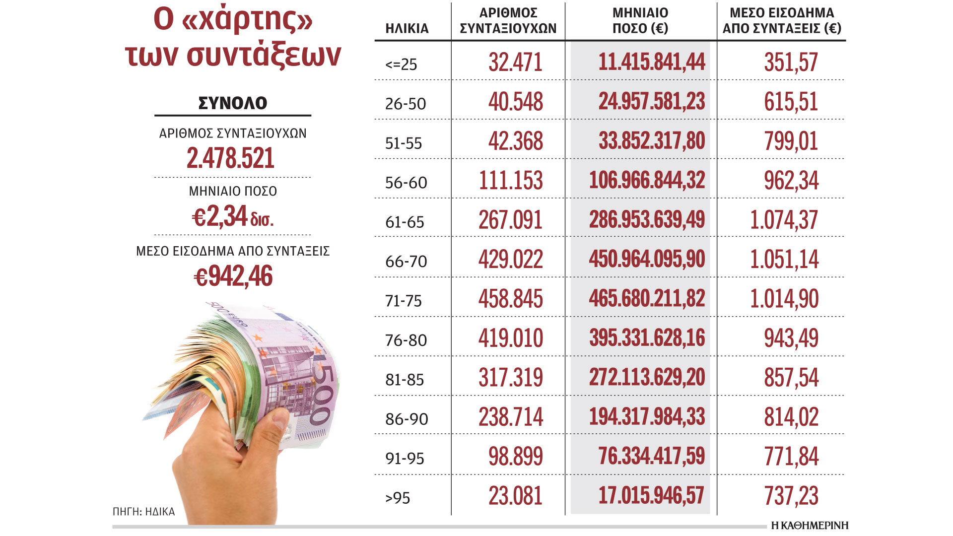 Τέσσερις στις 10 κύριες συντάξεις, ήτοι 1.175.553 ή 42,51%, κυμαίνονται μεταξύ 500 και 1.000 ευρώ. Υπάρχουν δε και άλλες 803.246 κύριες συντάξεις (29,04%) που είναι κάτω των 500 ευρώ.