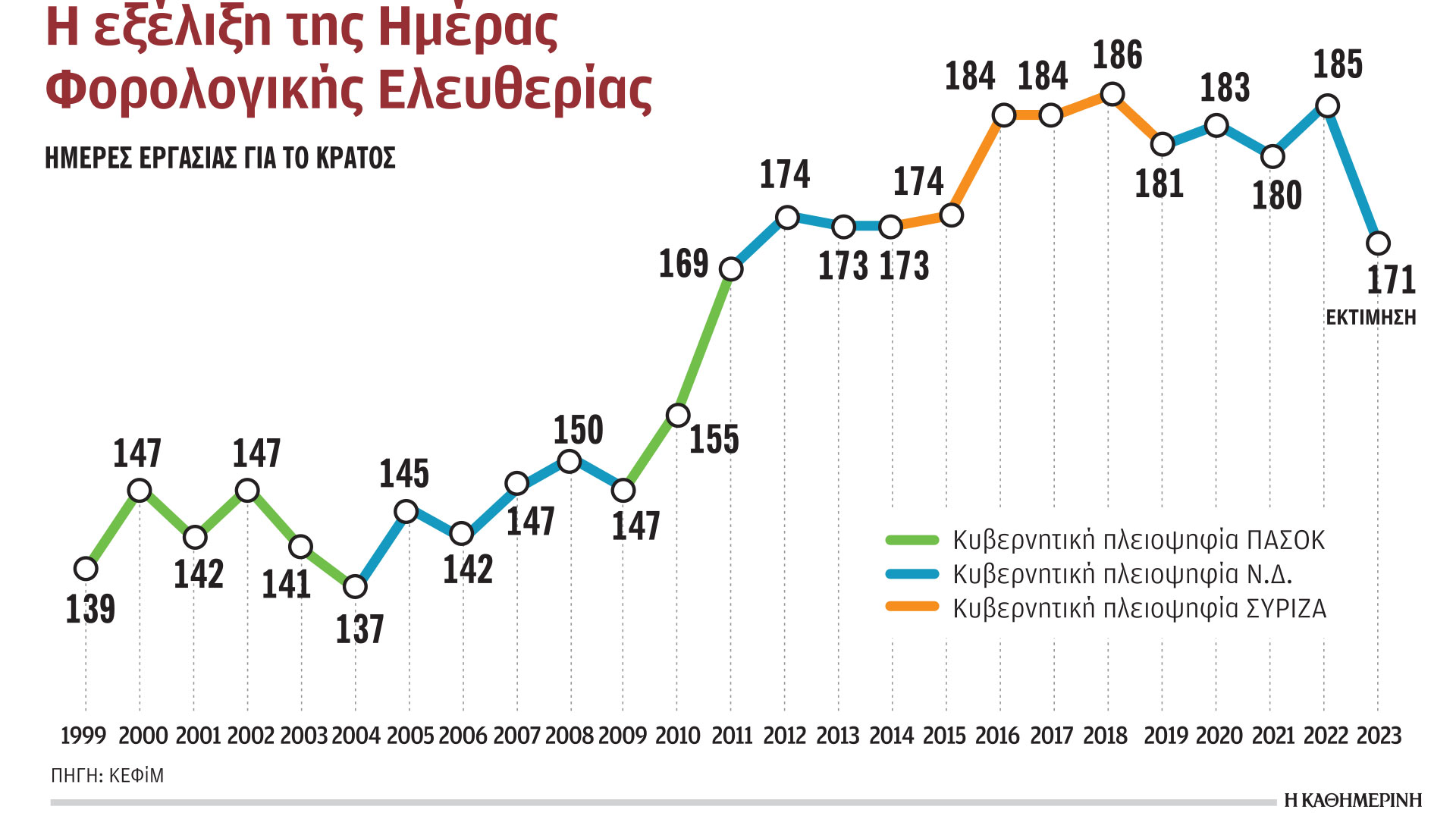 Οι 171 ημέρες εργασίας για το κράτος που προβλέπονται για το 2023 είναι η χαμηλότερη φορολογική επιβάρυνση από το 2011, όταν το αντίστοιχο μέγεθος ήταν 169 ημέρες. Αν συνυπολογιστεί το έλλειμμα της Γενικής Κυβέρνησης, τότε οι 178 ημέρες εργασίας για το κράτος που προβλέπονται για το 2023 είναι η χαμηλότερη φορολογική επιβάρυνση από το 2007, όταν το αντίστοιχο μέγεθος ήταν 177 ημέρες.