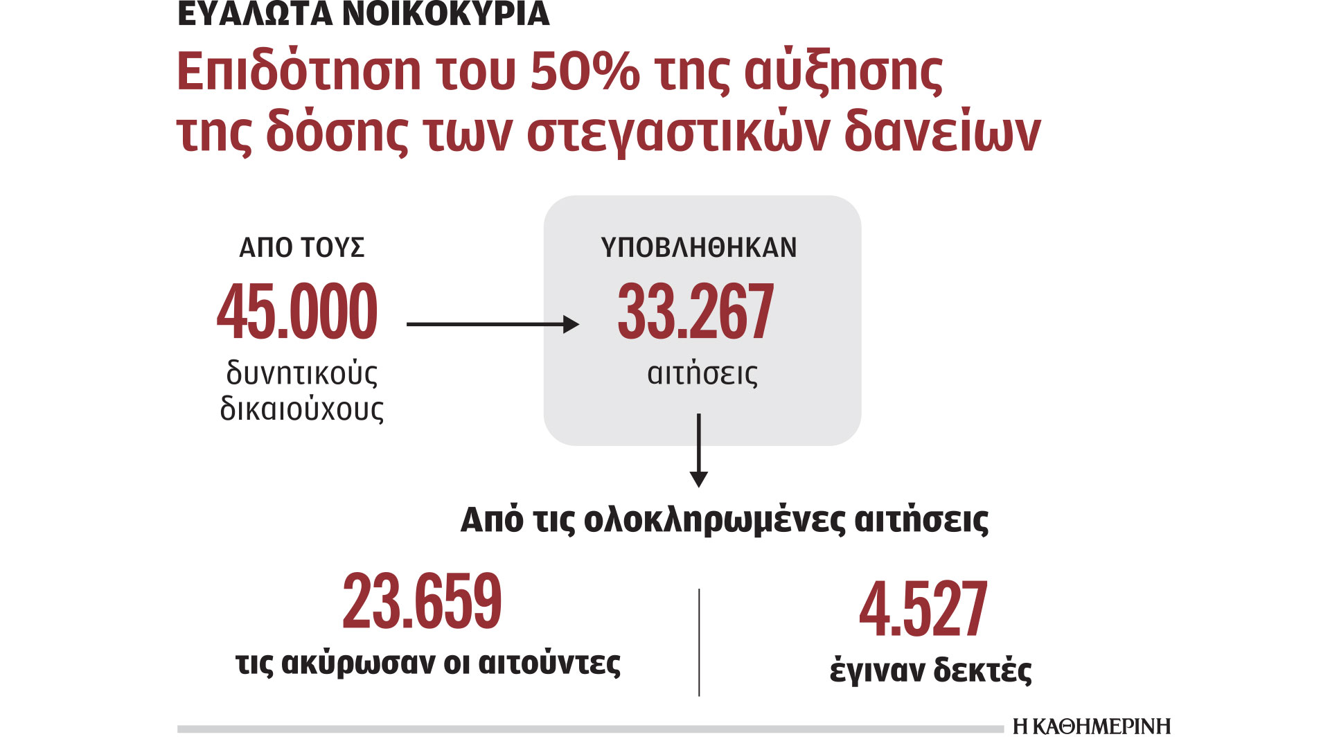 Δύο στους τρεις από τους δανειολήπτες που ήταν ένα βήμα πριν από την οριστική υποβολή αίτησης για να ενταχθούν στο πρόγραμμα επιδότησης της δόσης του στεγαστικού δανείου τους έχουν ακυρώσει με δική τους πρωτοβουλία την αίτηση, με συνέπεια μόλις 4.527 να είναι μέχρι σήμερα ο αριθμός των δικαιούχων.