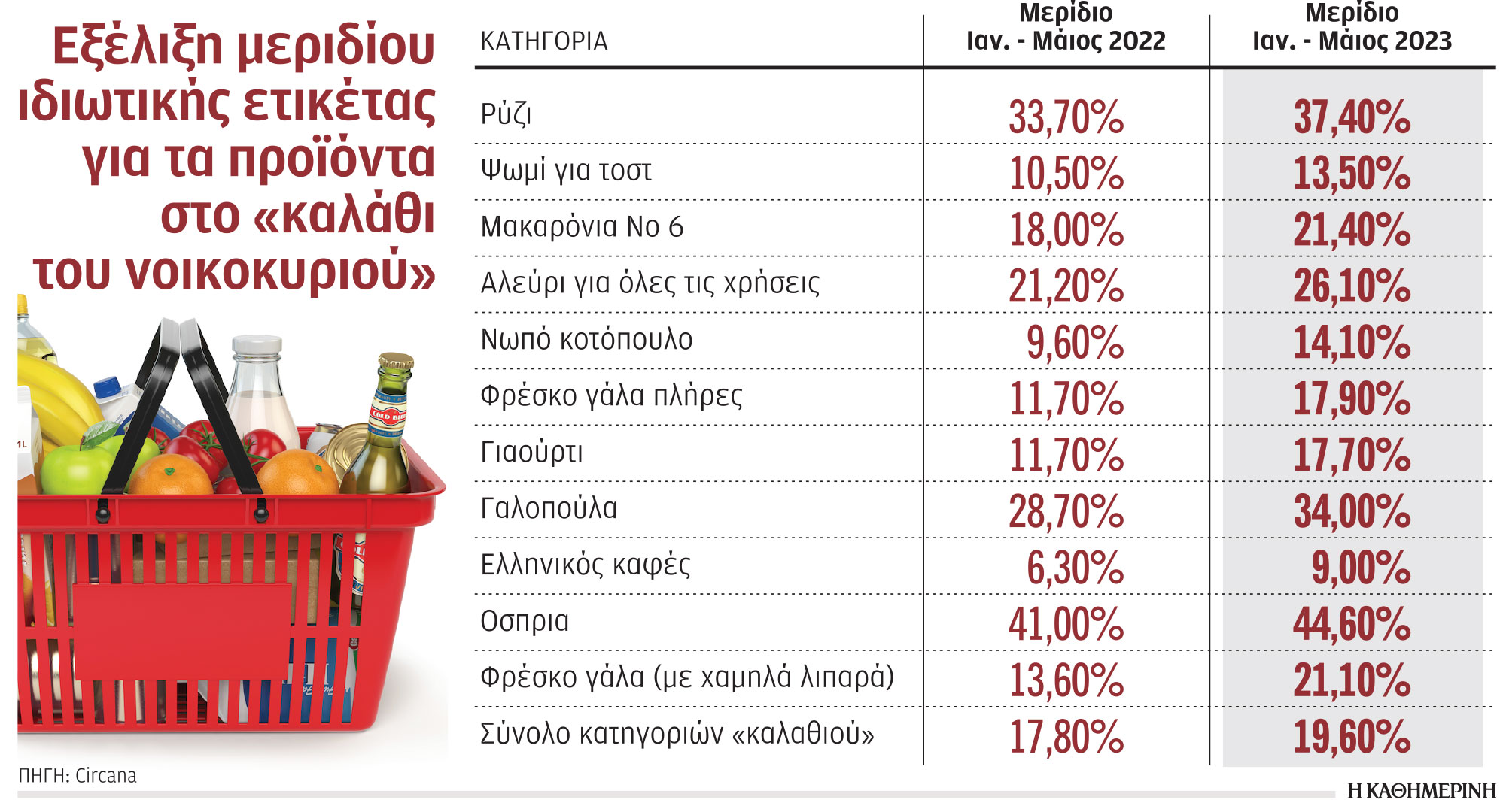 Αποκαλυπτικά είναι τα στοιχεία της εταιρείας ερευνών αγοράς Circana (πρώην IRI) για την επίδραση του «καλαθιού» στα μερίδια αγοράς. Στο σύνολο των κατηγοριών προϊόντων που συμμετείχαν στο «καλάθι», το μερίδιο αγοράς των προϊόντων ιδιωτικής ετικέτας από 17,8% το διάστημα Ιανουαρίου – Μαΐου 2022 διαμορφώθηκε σε 19,6% το αντίστοιχο διάστημα του 2023. Η αύξηση μάλιστα σε επιμέρους κατηγορίες από αυτές που συμμετείχαν στο «καλάθι» ήταν πολύ μεγαλύτερη. Ετσι, το μερίδιο αγοράς του φρέσκου γάλακτος ιδιωτικής ετικέτας αυξήθηκε από 11,7% σε 17,9%, του αγελαδινού γιαουρτιού από 11,7% σε 17,7%, του αλευριού για όλες τις χρήσεις σε 26,1% από 21,2% και των μακαρονιών σε 21,4% από 18,6%.
