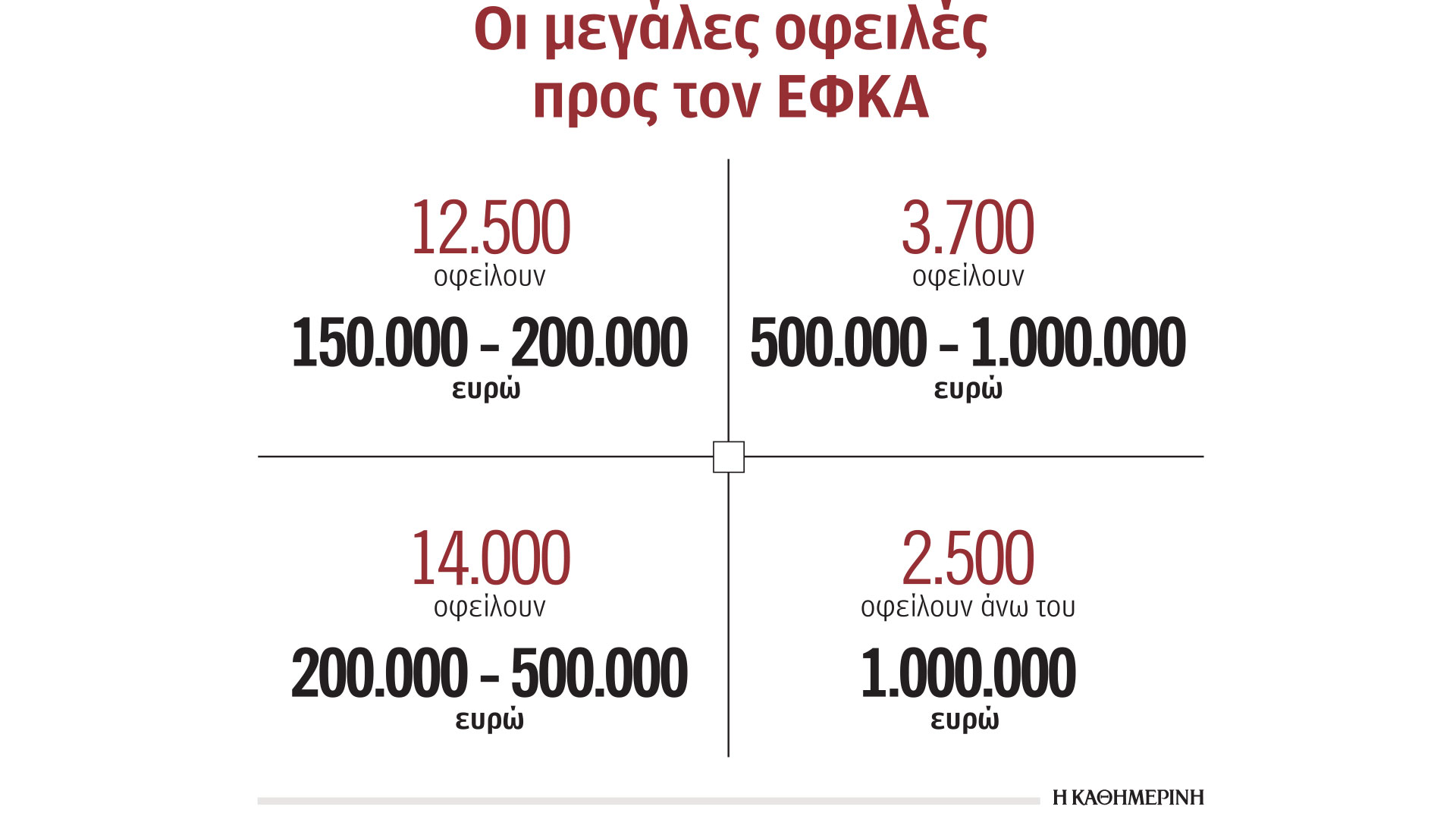 Σύμφωνα με τα πλέον διαθέσιμα στοιχεία του Κέντρου Είσπραξης Ασφαλιστικών Οφειλών, χρέη άνω των 150.000 ευρώ έχουν προς τα ασφαλιστικά ταμεία 33.000 οφειλέτες. Συνολικά η οφειλή ανέρχεται σε 19,5 δισ. ευρώ, εκ των οποίων τα μισά αφορούν την αρχική οφειλή και τα άλλα, πρόστιμα και προσαυξήσεις. Συγκεκριμένα, πάνω από 12.500 οφειλέτες έχουν χρέη μεταξύ 150.000-200.000 ευρώ. Συνολικά οφείλουν στον ΕΦΚΑ σχεδόν 1,4 δισ. ευρώ, ενώ επιπλέον 750 εκατ. ευρώ είναι οι προσαυξήσεις. Οφειλές μεταξύ 200.000 και 500.000 ευρώ έχουν 14.000 οφειλέτες. Η συνολική οφειλή (2,2 δισ. ευρώ) και οι προσαυξήσεις (1,9 δισ. ευρώ) ξεπερνούν τα 4 δισ. Επιπλέον 3.700 μεγαλοοφειλέτες με χρέη μεταξύ 500.000 και 1.000.000 ευρώ, χρωστούν στον ΕΦΚΑ συνολικά άλλα 2,5 δισ. ευρώ. Τέλος, υπάρχουν επιπλέον 2.500 οφειλέτες με χρέη άνω του 1.000.000 ευρώ. Αυτά τα χρέη (5 δισ. κύρια οφειλή συν 5,7 δισ. ευρώ τόκοι) είναι ίσα με τις οφειλές όλων των προηγούμενων περίπου 30.000 μεγαλοοφειλετών.