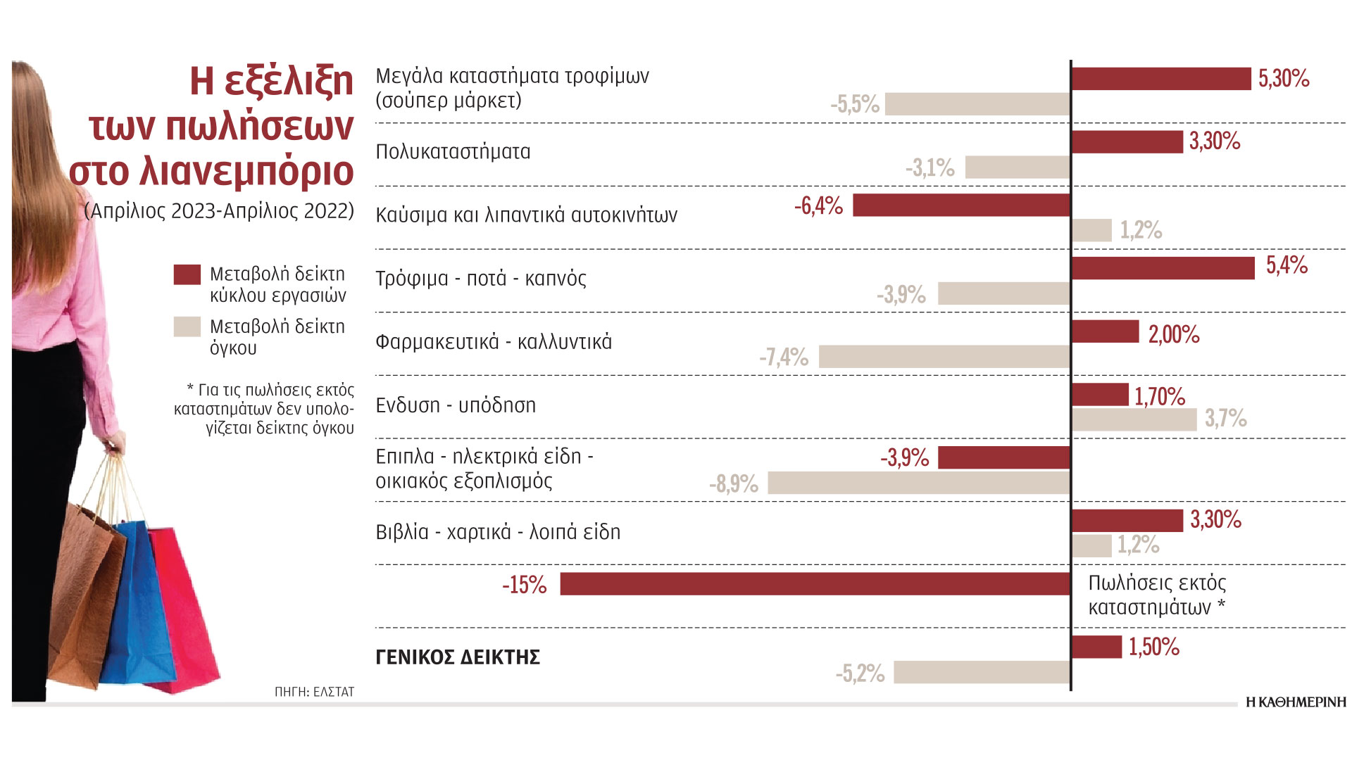Στα σούπερ μάρκετ η μείωση του όγκου πωλήσεων ήταν τον Απρίλιο 5,5%, με την αύξηση του τζίρου να είναι 5,3%, καθαρά δηλαδή πληθωριστική. Ανάλογη ήταν η εικόνα και στα λοιπά καταστήματα τροφίμων, με αύξηση του τζίρου κατά 5,4% και μείωση του δείκτη όγκου κατά 3,9%. Μειωμένος κατά 3,7% ήταν ο όγκος πωλήσεων στην ένδυση – υπόδηση, με τον τζίρο να καταγράφει αύξηση 1,7%.