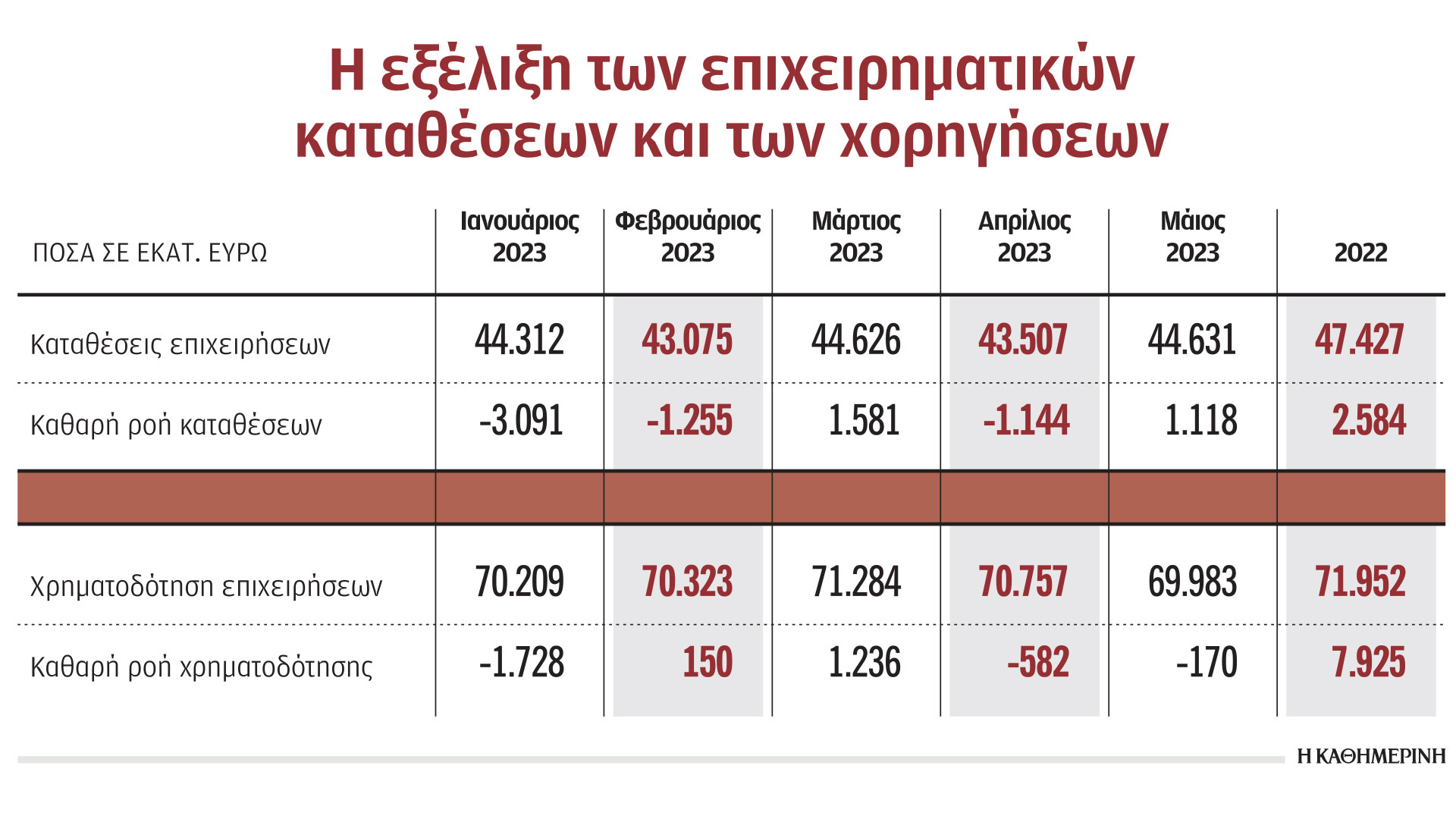 Η προσπάθεια των επιχειρήσεων να αποφύγουν την επιβάρυνσή τους από την αύξηση του κόστους που συνεπάγεται η άνοδος των επιτοκίων στο κόστος δανεισμού αποτυπώνεται ήδη στα στοιχεία για την πορεία της πιστωτικής επέκτασης το πρώτο πεντάμηνο του έτους, που δείχνουν ότι παρά τις σημαντικές εκταμιεύσεις δανείων στις οποίες έχουν προχωρήσει οι τράπεζες το ίδιο διάστημα, η αρνητική ροή χρηματοδότησης ανήλθε στο -1,1 δισ. ευρώ, έναντι θετικής ροής χρηματοδότησης ύψους 7,9 δισ. ευρώ το 2022. Η αρνητική ροή χρηματοδότησης δείχνει ότι οι αποπληρωμές δανείων ήταν μεγαλύτερες από τις νέες χορηγήσεις και όπως σημειώνει η ΤτΕ αυτό ερμηνεύεται από την εκτίμηση ότι «κάποιες επιχειρήσεις αποφεύγουν να αναλάβουν χρέος με σταθερό επιτόκιο για πολύμηνες περιόδους, ενδεχομένως επειδή αναμένουν αποκλιμάκωση των επιτοκίων στο εγγύς μέλλον ή επειδή δεν γνωρίζουν σε ποια έκταση θα χρειαστεί να χρησιμοποιήσουν δανειακούς πόρους». Σε υποχώρηση του ετήσιου ρυθμού πιστωτικής επέκτασης προς τις επιχειρήσεις αναμένεται να οδηγήσει και η επιβράδυνση του ρυθμού ανόδου του ΑΕΠ το 2023, αλλά όπως σημειώνει η ΤτΕ αυτή η επιβράδυνση θα είναι σε ήπια, ετήσια ποσοστά.